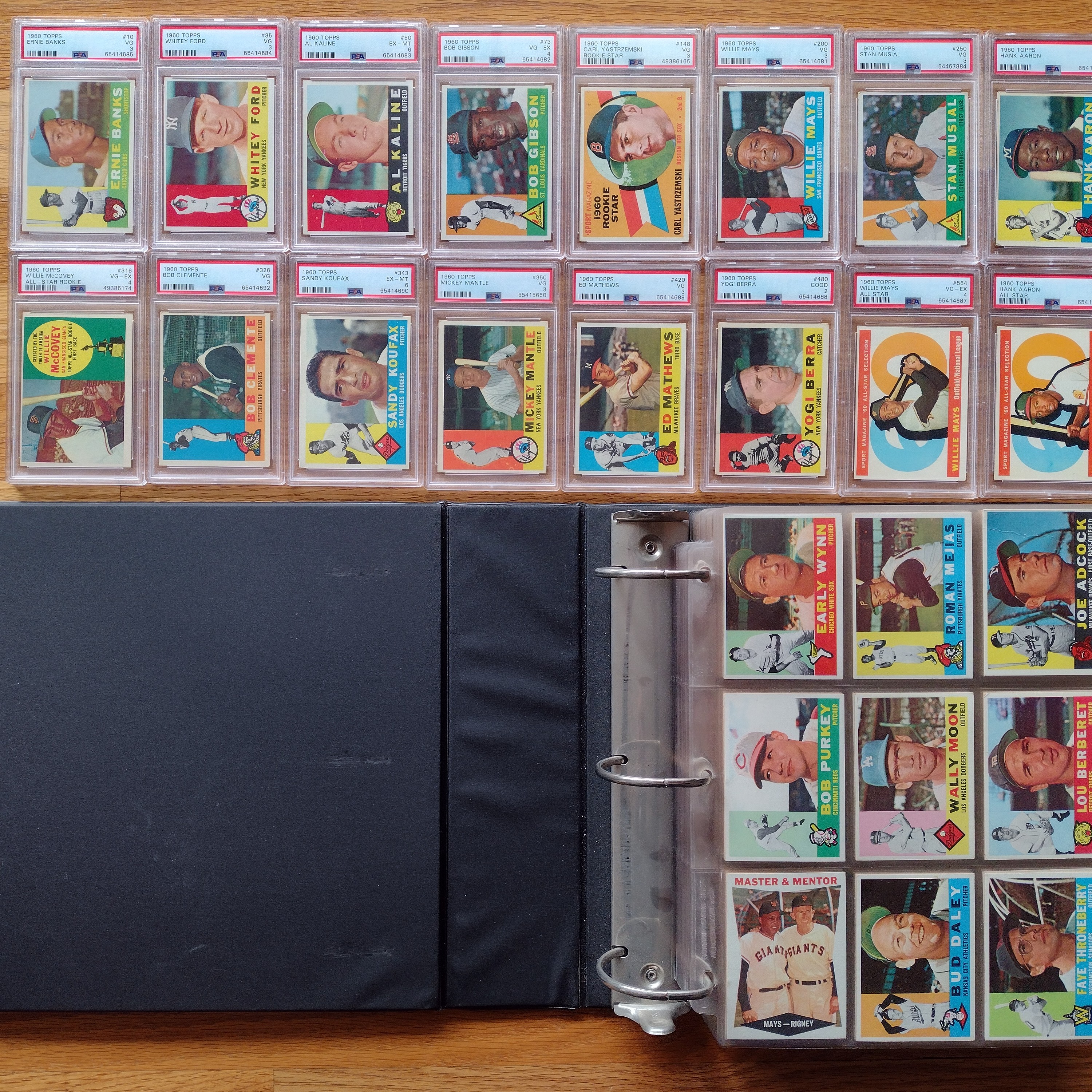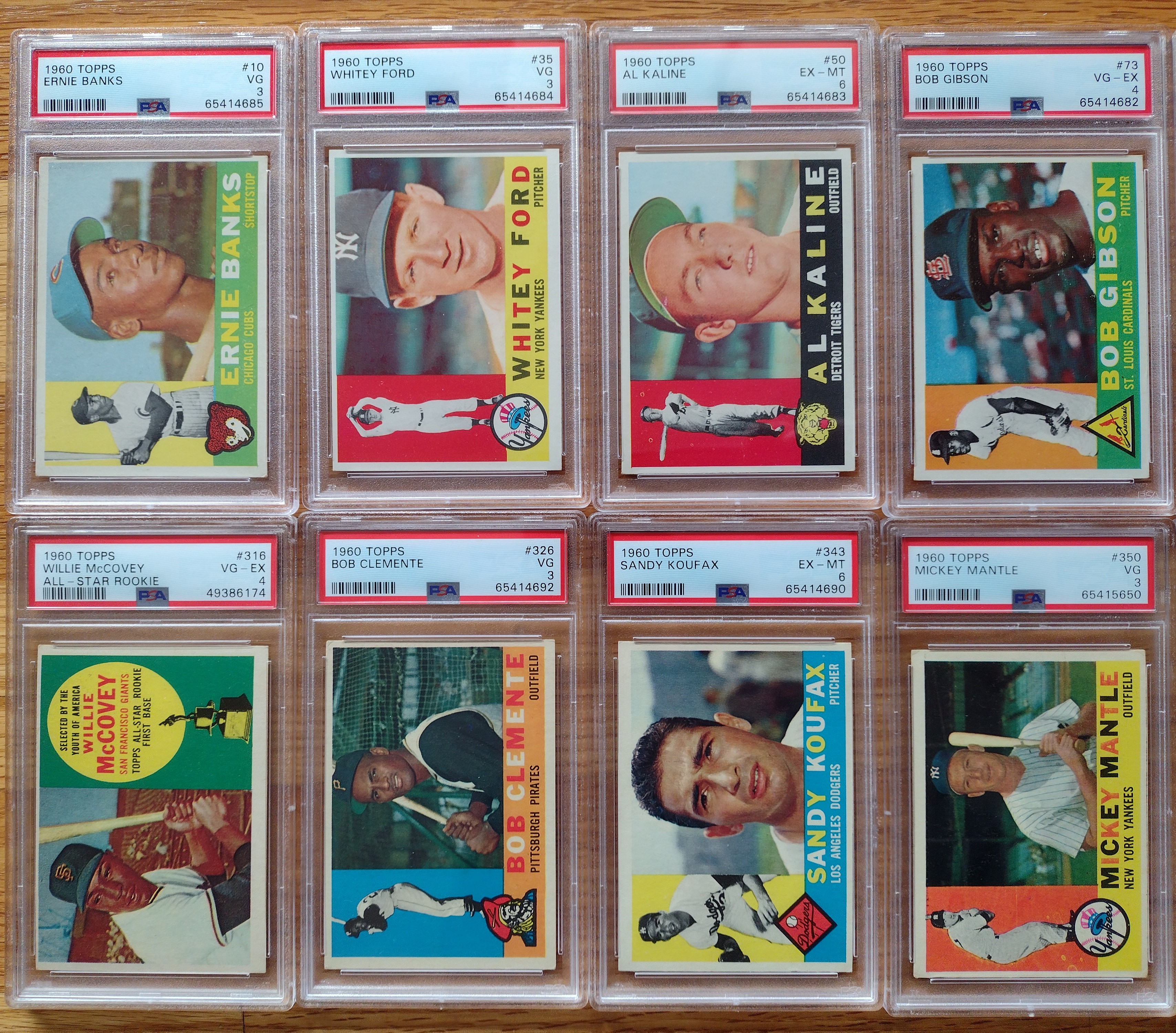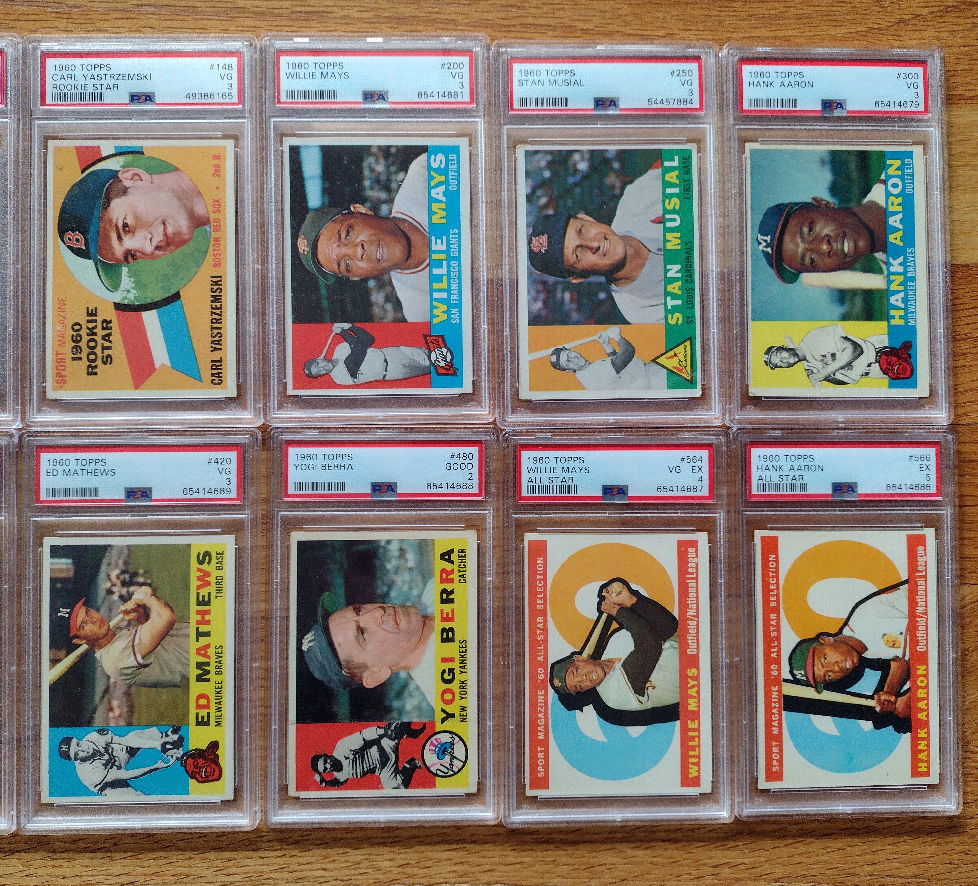 This is a complete set. 17 graded PSA cards: 10 Banks 3 35 Ford 3 50 Kaline 6 73 Gibson 4 148 Yastrzemski 3 200 Mays 3 250 Musial 3 300 Aaron 3 316 McCovey 4 326 Clemente 3 343 Kousfax 6 350 Mantle 3 420 Mathews 3 480 Berra 2 563 Mantle A-S 6 564 Mays A-S 4 566 Aaron A-5 5 Average grade of 3.76. Assume the rest of the cards are of similar quality, but ungraded.