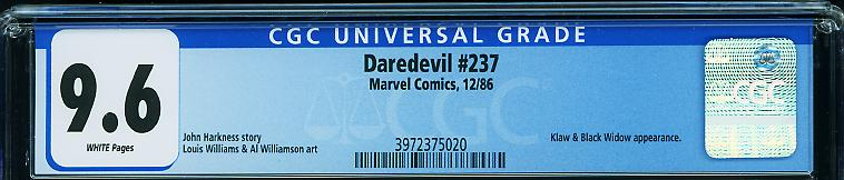 CGC 3972375020 Seller's Grading Comments: 12/1986 - Cover pencils possibly by Keith Pollard. Context! starring Daredevil, Black Widow [Natasha Romanov], Karen Page, and Klaw , script by Steve Englehart [as John Harkness], pencils by Louis Williams, inks by Al Williamson and Danny Bulanadi; Klaw tries to re-establish his rep by taking down Daredevil.