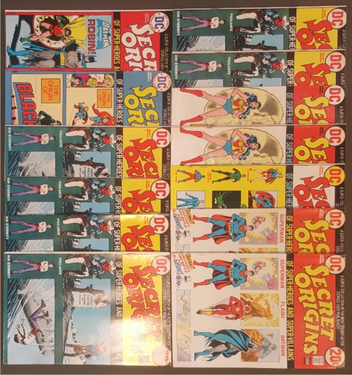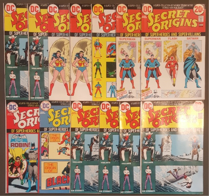 SECRET ORIGINS (1973-1974) #1 (2 copies), #2, #3 (2 copies), #4 (6 copies), #6 and #7. Overall average grade for the lot is FN 6.0 (unless otherwise noted). 2022 Overstreet value for this 13 issue group is $168.00 based on condition. (BS78)