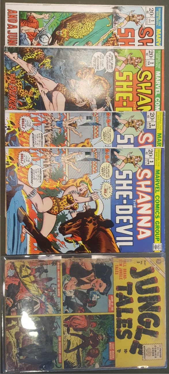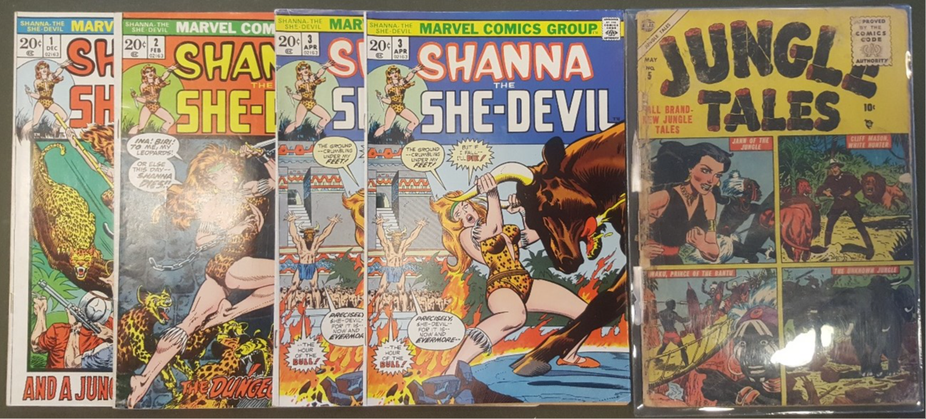 SHANNA THE SHE DEVIL (1972-1973) #1 (VF), #2 (FN/VF), #3 (VF-), #3 (VG+) and JUNGLE TALES (1955) #6 (FR). 2022 Overstreet value for this 5 issue group is $137.00 based on condition. (BS92)