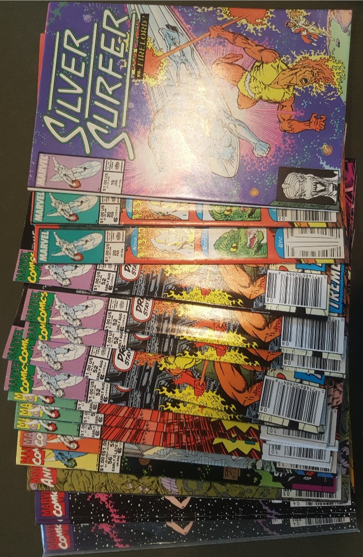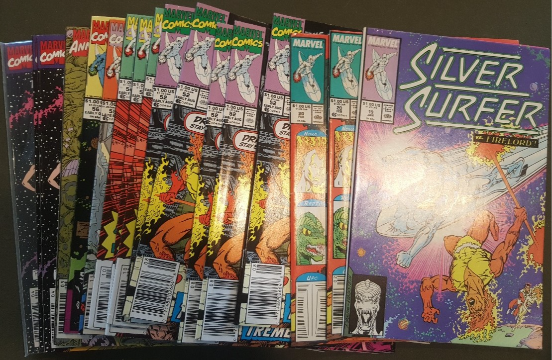 SILVER SURFER (1989-1991) #19, #20 (2 copies), #52 (5 copies), #54 (3 copies), #55, #56, SILVER SURFER ANNUAL (1990-1991) #3 and #4 (4copies). Overall average grade for the lot is VF/NM 9.0 or better. 2022 Overstreet value for this 18-issue group is $106.00 based on condition. (BS62)