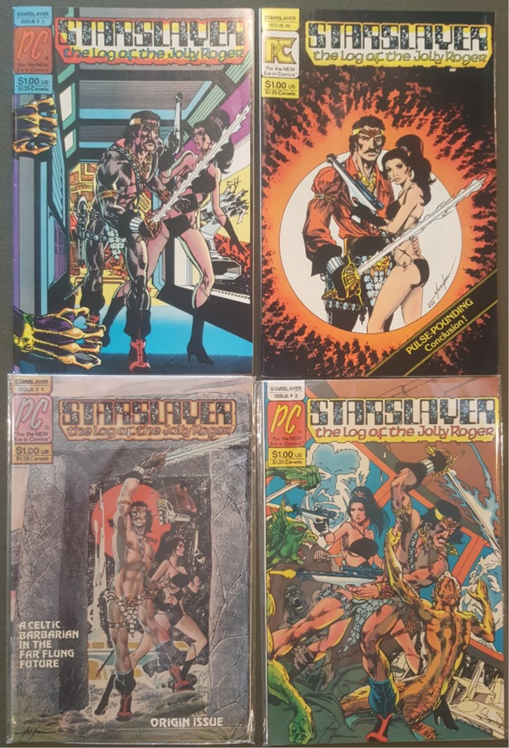 STARSLAYER (1982-1983) #1 (NM-), #2 (NM-), #3 (NM) and #4 (NM-). *NOTE: Issue #2 and #3 feature the 1st and 2nd appearance of the Rocketeer. Script and art by Dave Stevens. 2022 Overstreet value for this 4-issue lot of comics is $102.00 based on condition. (M24)