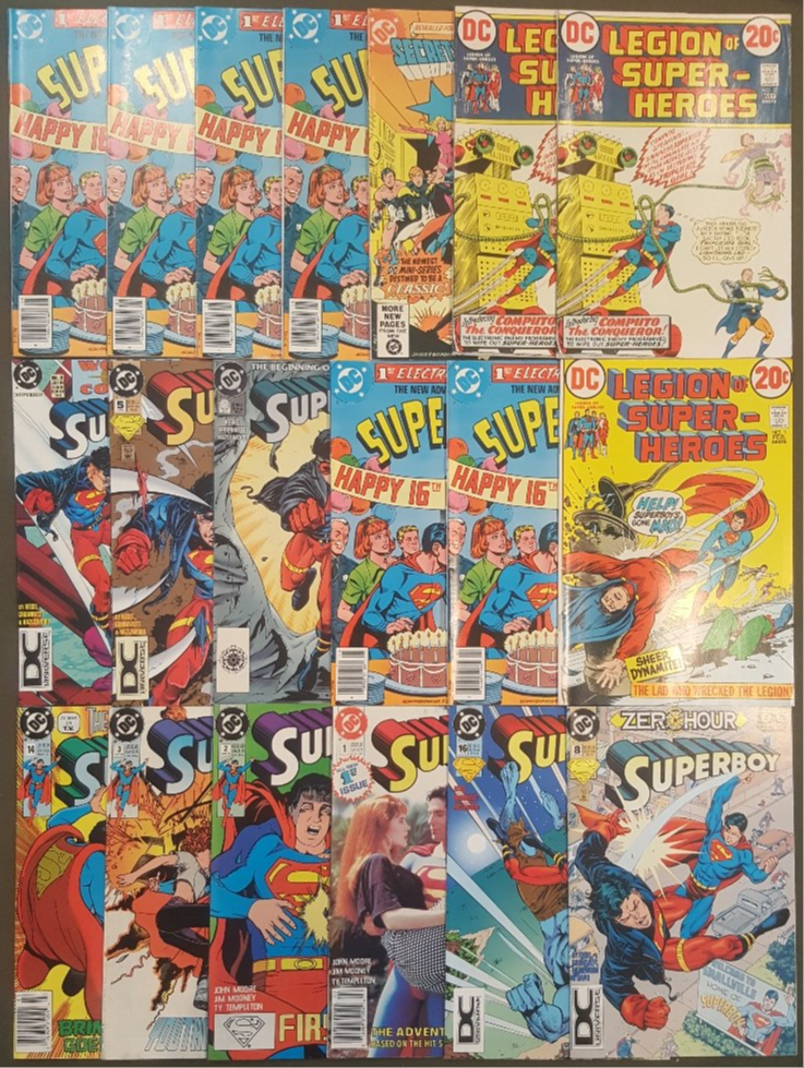 LEGION OF SUPER HEROES (1973) #1, #3 (2 copies), NEW ADVENTURES OF SUPERBOY (1980) #1 (6 copies), SECRETS OF THE LEGION OF SUPER HEROES (1981) #1, SUPERBOY (1990-1991) #1, #2, #3, #14, SUPERBOY (1994-1995) #0, #5, #6, #8 and #16. Individual grades very from FN- 5.5 to NM+ 9.6. Overall average grade for the lot is VF/NM 9.0. 2022 Overstreet value for this 19-issue group is over $208.00 based on condition. (BS68)