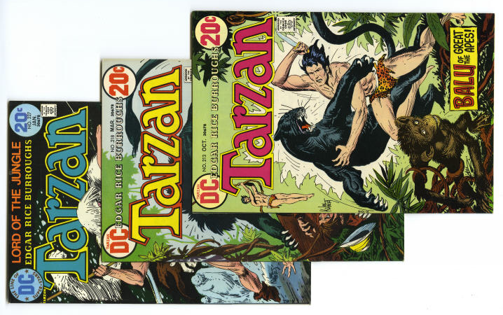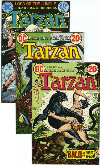 TARZAN (1972-1974) #213, 218 and 227 Group. This lot of 30 (thirty) comics consists of multiple copies of three different Tarzan issues including #213 (10 copies), #218 (10 copies), and #227 (10 copies). Overall, these average NM- 9.2. Approximate 2022 Overstreet value for group is $680.00. (LL35)