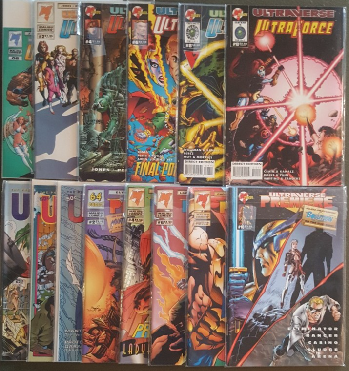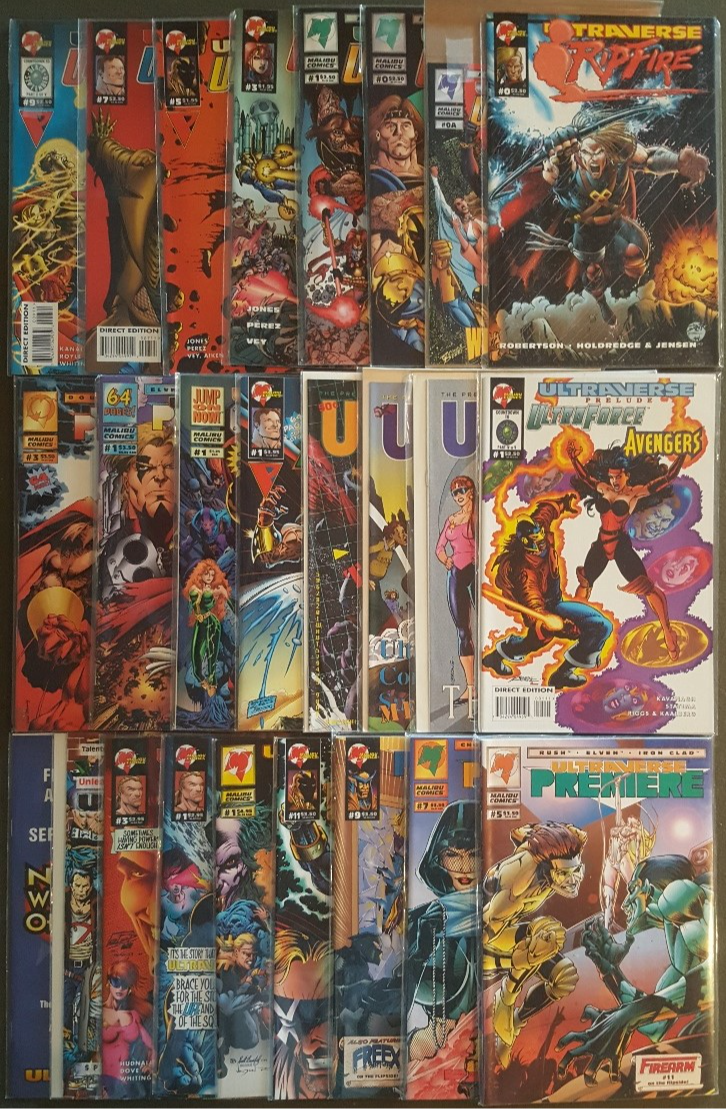Ripfire (1995) #0, Ultraforce #0, 0A (ashcan), 0B (ashcan), 1-10, Ultraforce/Avengers Prelude #1, Ultra Monthly (1993) #1-6, Ultraverse Double Feature (1995) #1, Ultraverse Origins (1994) #1, Ultraverse Premiere (1994-1995) #1-11, Ultraverse Year One (1994) #1, Ultraverse Year Zero (1995) #1, 3, Unleashing The Ultraverse (1993) #1. Overall grade for the lot is NM 9.4 or better. 2022 Overstreet value for this 38-issue lot of high-grade comics is $200.00 based on condition.