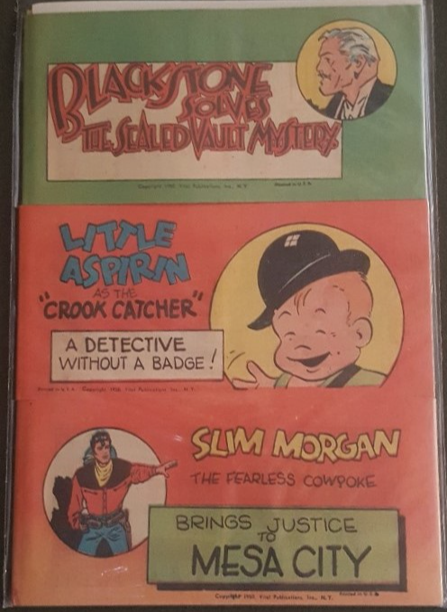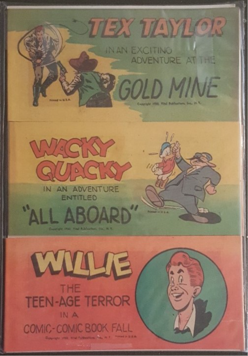 Wisco Mini-Comic Set (1949-1950) of 6 different high-grade issues. Includes Blackstone Solves the Seal Vault Mystery, Little Aspirin as Crook Catcher, Slim Morgan Brings Justice to Mesa City, Tex Taylor Exciting Adventure at the Gold Mine, Wacky Quacky in All Aboard and Willie The Teen-Age Terror. These promotional giveaway mini-comics were published by Timely Comics and distributed by a variety of merchants including Wisco "99" Service Stations, Carnation Malted Milk, Klarer Health Wieners, Fleers Dubble Bubble Gum, Rodeo All-Meat Wieners, Perfect Potato Chips, & others. Back cover blank or printed with information about participating sponsor. 24 pages, full color, 7-in. x 3.5-in., all newsprint, no cover price. Average grade for the overall lot is NM 9.4 condition. 2023 Overstreet guide value on this set is $245.00. (LL45)