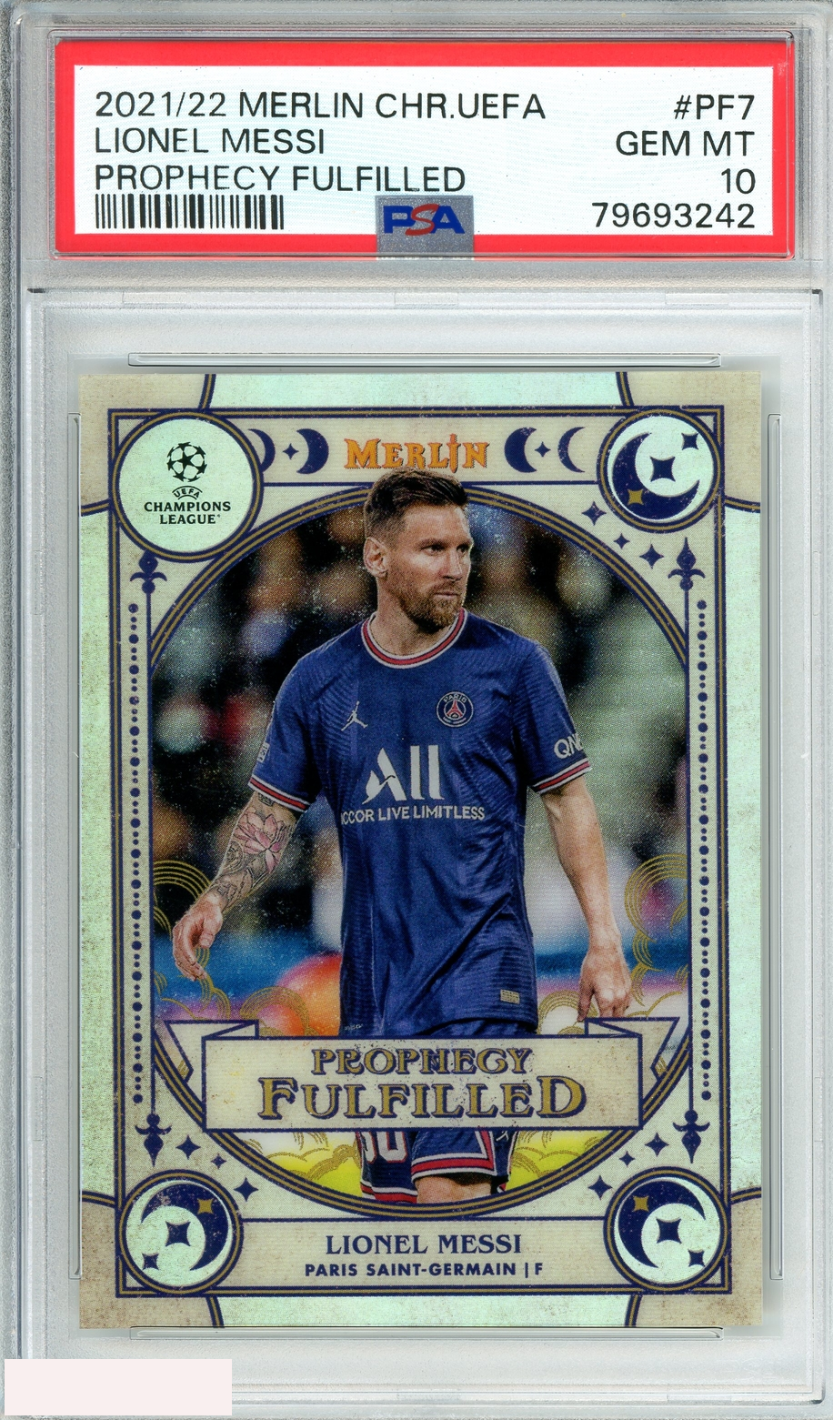 CERT NUMBER - 79693242 LABEL TYPE - LIGHTHOUSELABEL YEAR - 2021-2022 BRAND - TOPPS MERLIN CHROME UEFA LEAGUE PROPHECY FULFILLED CARD NUMBER - PF7 PLAYER - LIONEL MESSI VARIETY - PROPHECY FULFILLED CARD GRADE - 10 GRADE DESC - GEM MT GRADED - YES ORIGINAL TEAM - PARIS SAINT GERMAIN CONDITION - GEM MINT