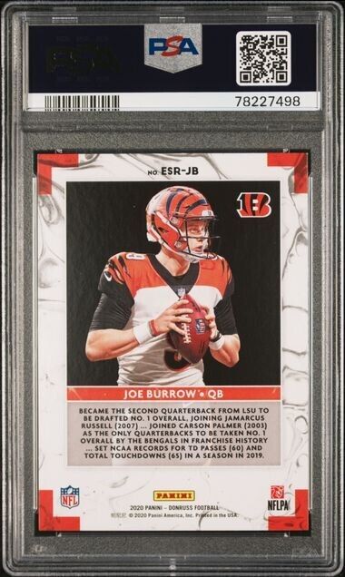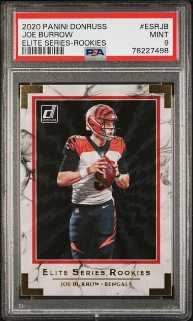Own a piece of football history with this 2020 Panini Donruss Elite Series Rookies Joe Burrow #ESRJB trading card. This gem from the National Football League (NFL) features the Cincinnati Bengals quarterback and is graded 9 by Professional Sports Authenticator (PSA). The card is from the 2020 Panini Donruss Elite set and has a number of great features, including being a rookie card and an insert. This sports trading card will make a great addition to any collection and is sure to impress. Don't miss out on the opportunity to own this Joe Burrow card today! Listed With Mascot.