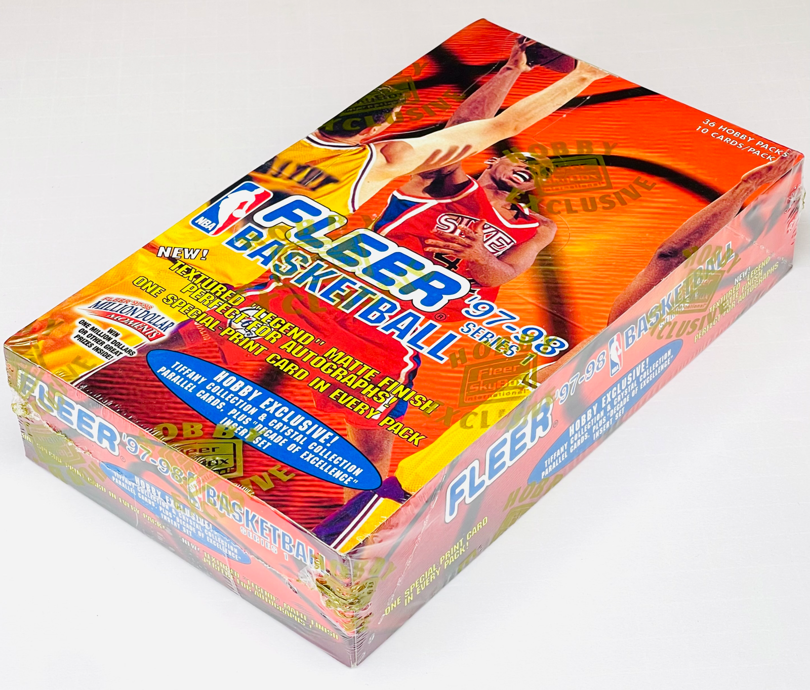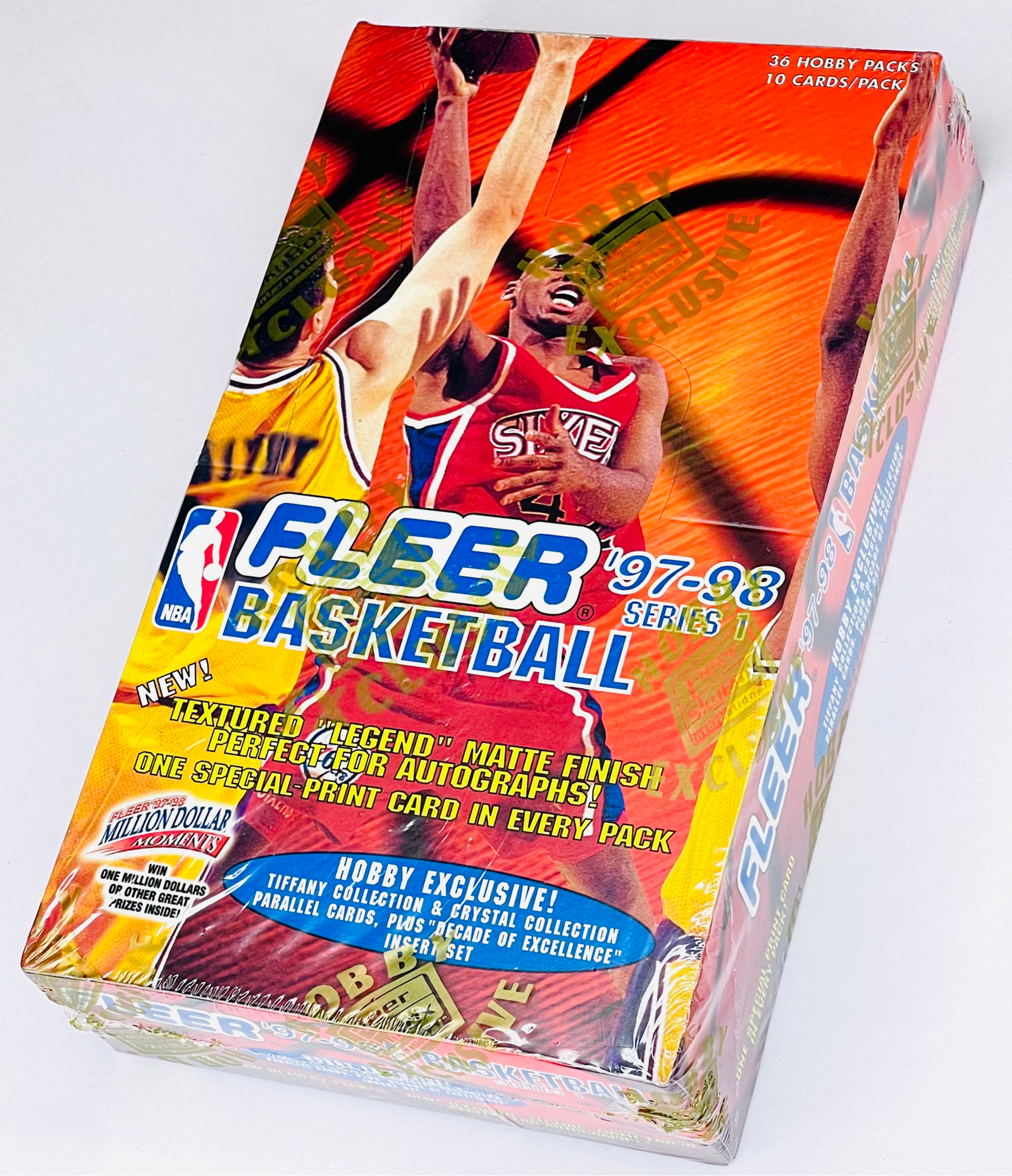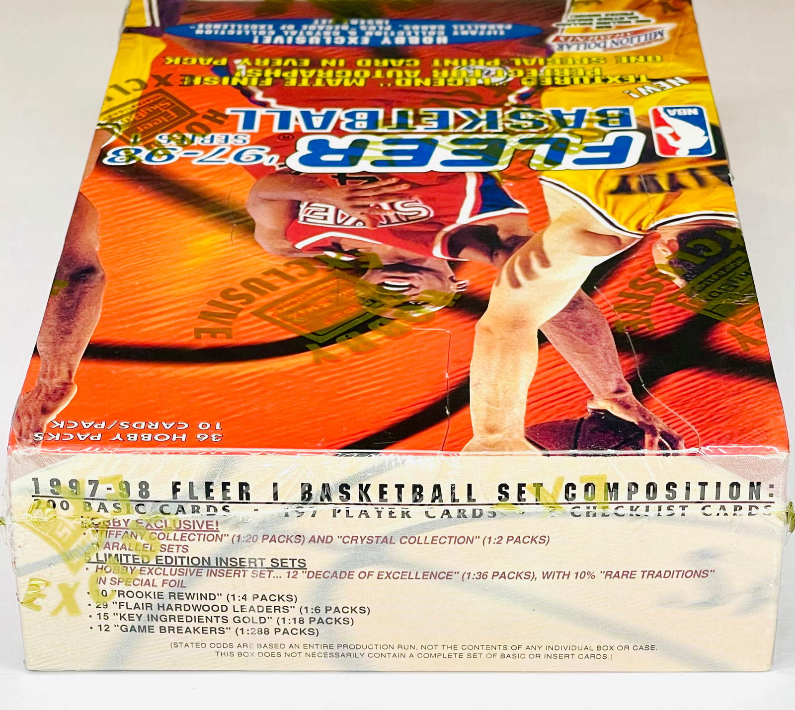 SEALED HOBBY BOX 1997-98 Fleer - Series 1 Basketball 36 packs, 10 cards per pack (360 cards total) One of the most famous sets of all time, featuring some of the most famous & expensive Michael Jordan cards ever (Game Breakers, Tiffany Collection, Decade of Excellence Rare Traditions) and a classic era of players including Kobe Bryant (2nd year), Shaquille O’Neal, Allen Iverson, Kevin Garnett, Scottie Pippen, and Anfernee Hardaway. Pristine condition. You will receive the exact box pictured. Shipped with care. Inserts & Pack Odds: Crystal Collection 1:2 Rookie Rewind 1:4 packs Flair Hardwood Leaders 1:6 Key Ingredients Gold 1:18 Tiffany Collection 1:20 Decade of Excellence 1:40 Game Breakers 1:288 Decade of Excellence Rare Traditions 1:360