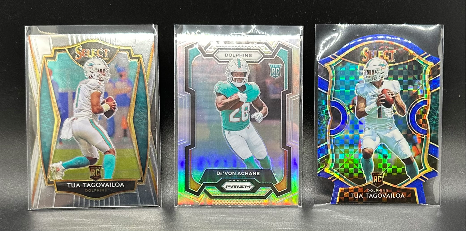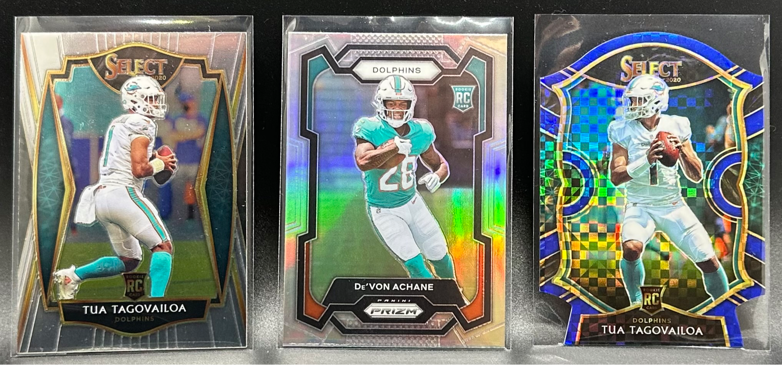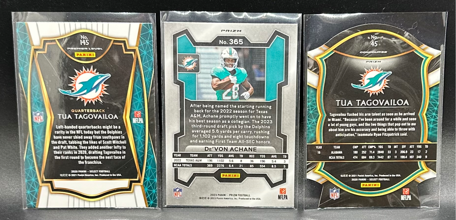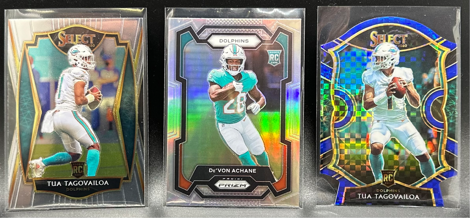 (3) LOT MIAMI DOLPHINS 2020 TUA TAGOVAILOA SELECT BLUE DIE CUT RC DE’VON ACHANE 2023 PRIZM SILVER ROOKIE