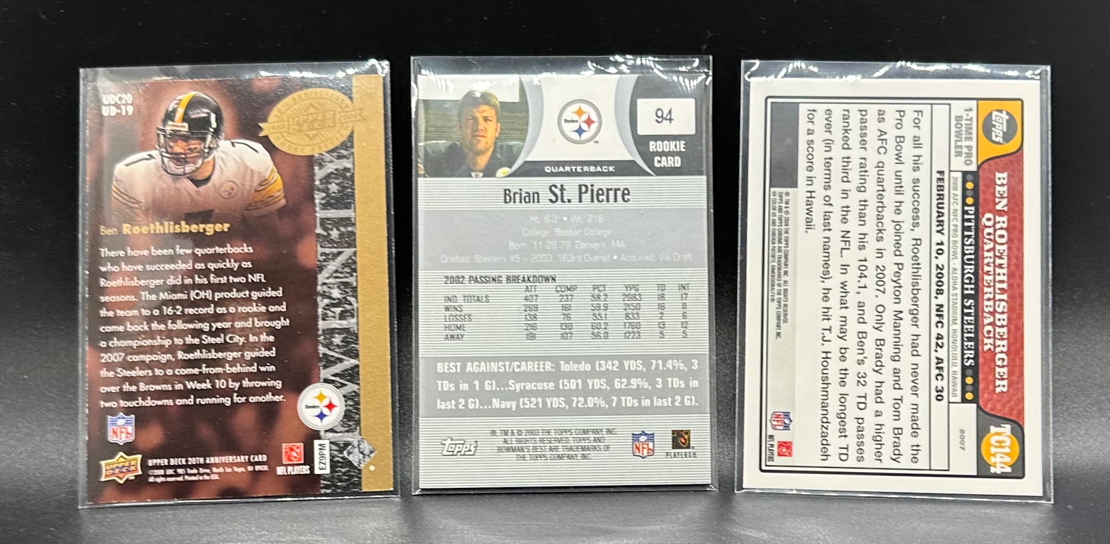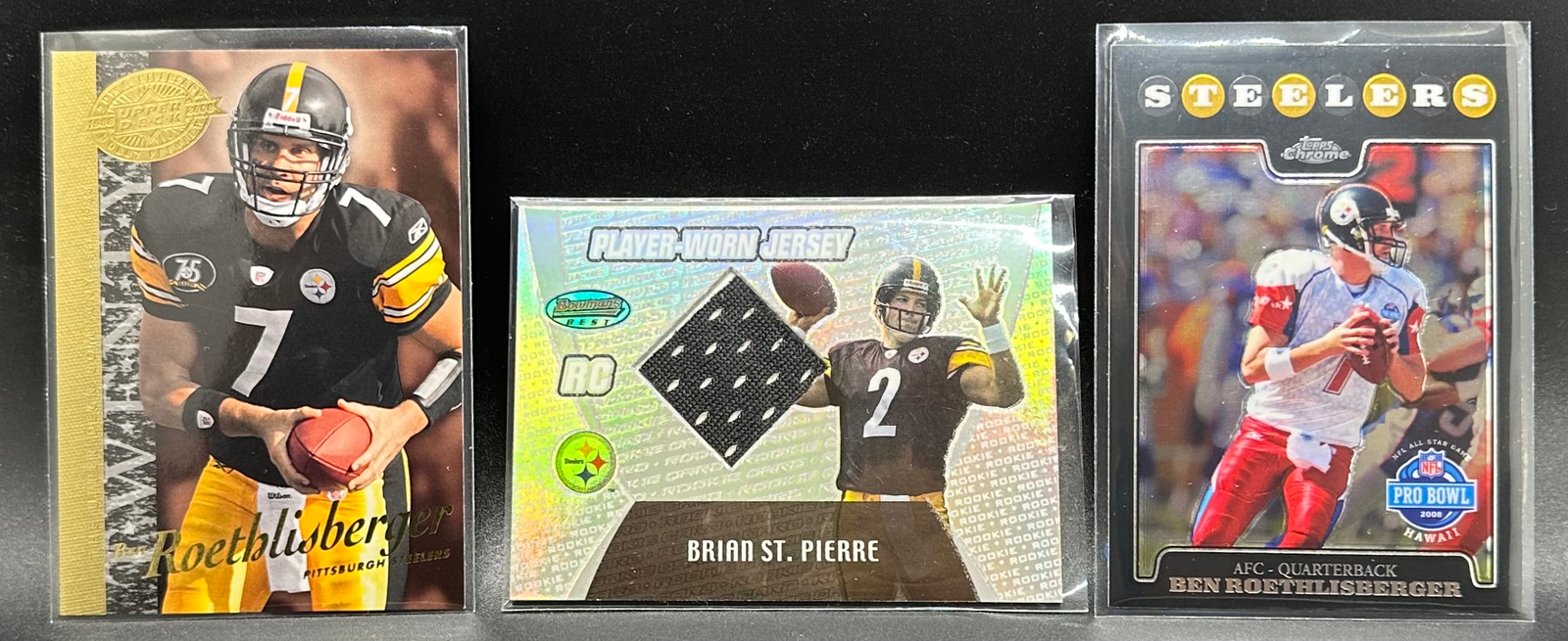 (3) PITTSBURGH STEELERS BEN ROETHLISBERGER 2008 UD HOBBY PREVIEW TOPPS CHROME BRIAN ST PIERRE WORN JERSEY MVP