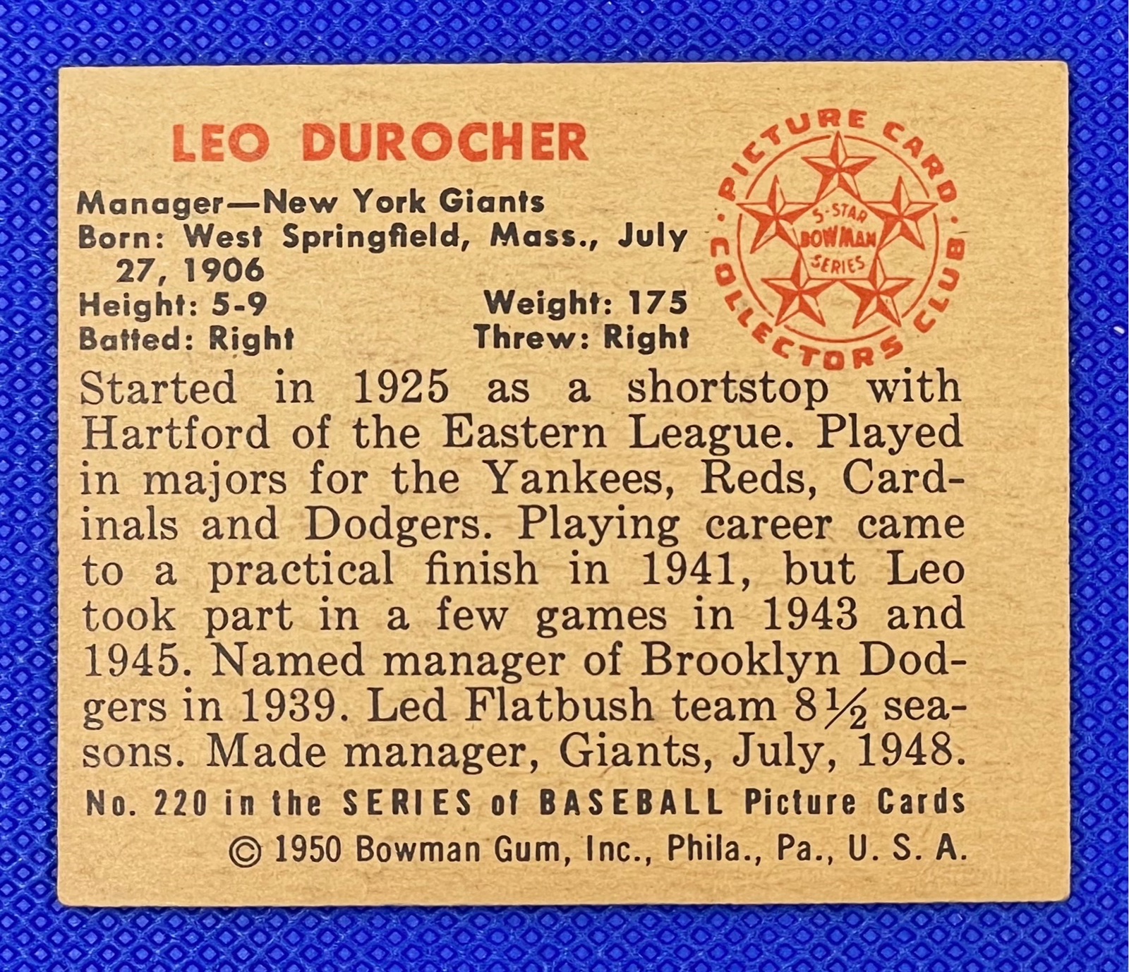 1950 Bowman #220 Leo Durocher HOF New York Giants 🔥⚾🔥⚾