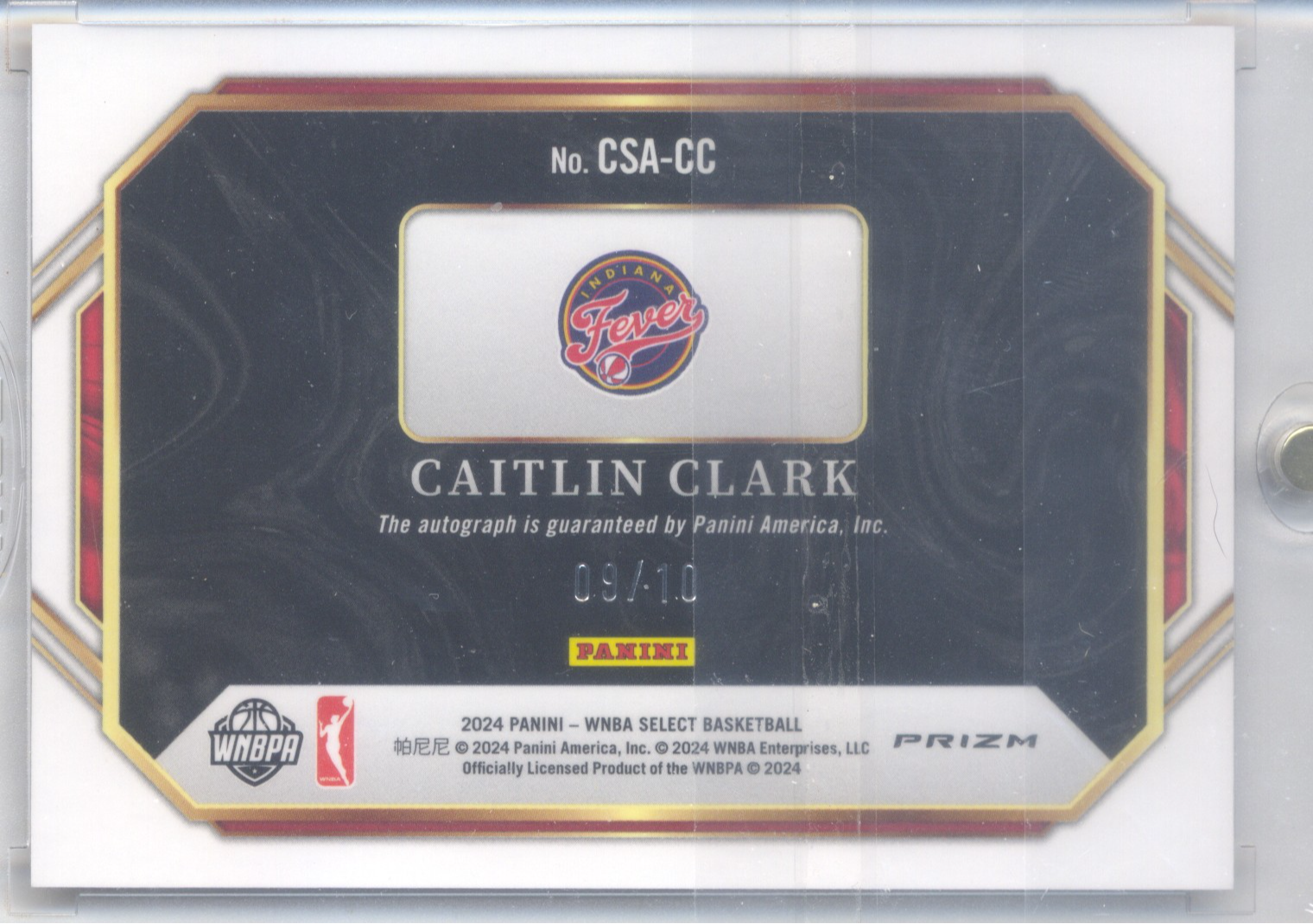 This is a Gold Rookie Autograph card of Caitlin Clark, serial numbered # 09/10, WNBA Indiana Fever Signature.