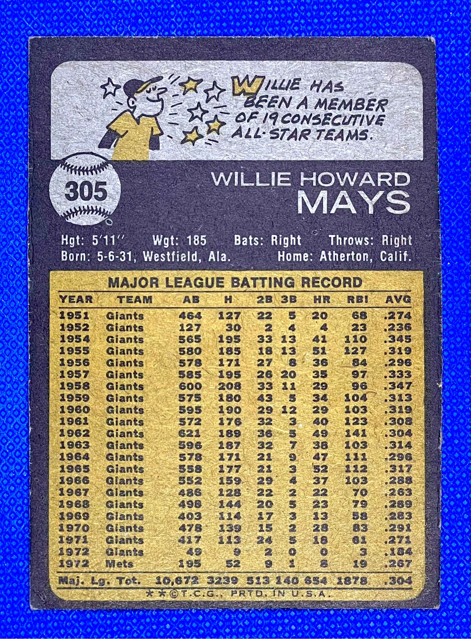 1973 Topps #305 Willie Mays HOF New York Mets 🔥⚾🔥⚾