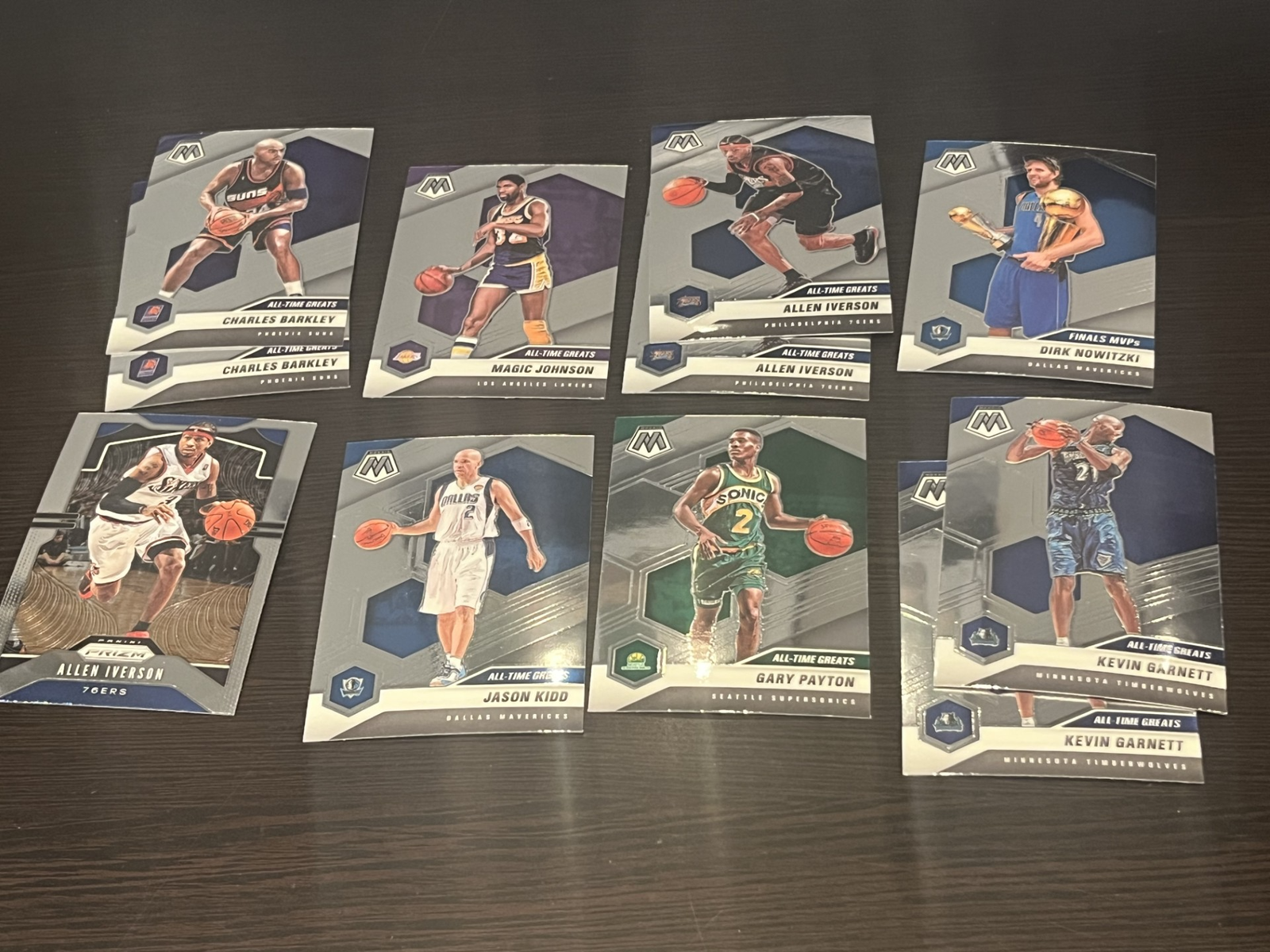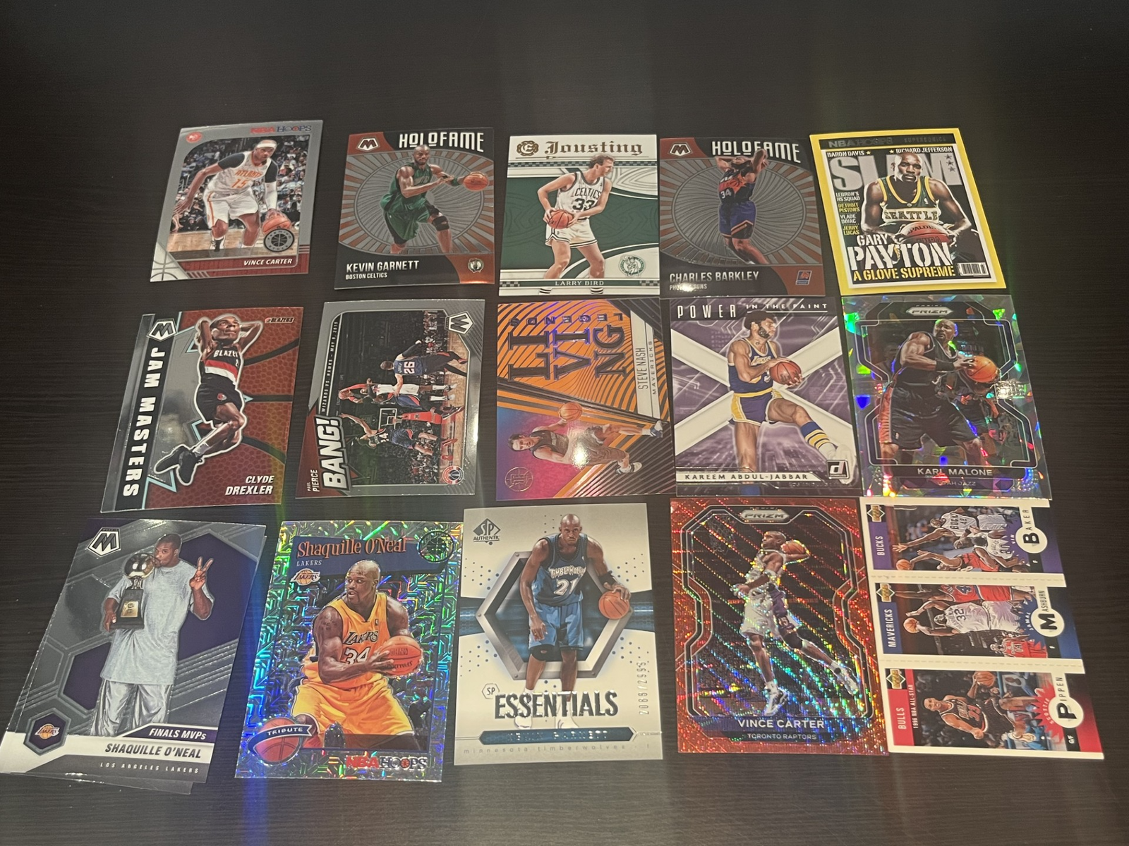 You are bidding on a lot of (27) NBA HOF basketball cards! Every card is a HOF'er! Ever card is pictured. Highlights: 2021 Prizm Red Wave #117 Vince Carter 21-22 Prizm Cracked Ice #259 Karl Malone 2005 SP Authentic #114 Kevin Garnett /2999 20-21 Illusions Living Legends #12 Steve Nash 19-20 Hoops Premium Stock Silver Mojo #283 Shaquille O'Neal 20-21 Mosaic Holofame #2 Charles Barkley 21-22 Donruss Power in the Paint #2 Kareem Abdul Jabbar 21-22 Hoops Slam #67 Gary Payton 20-21 Mosaic Holofame #6 Kevin Garnett 20-21 Mosaic Bang #10 Paul Pierce 16-17 Excalibur Jousting #25 Larry Bird