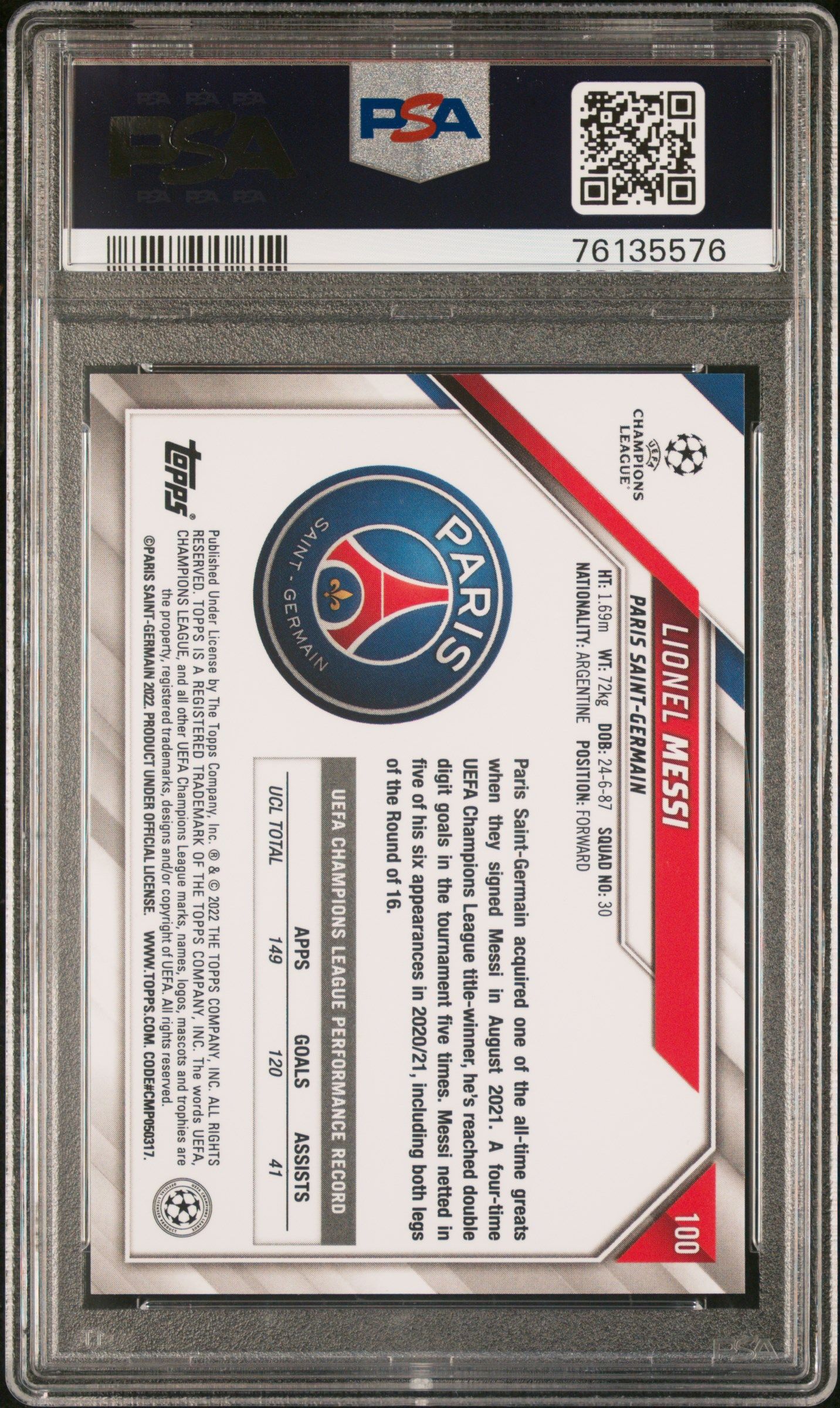 2021-2022 TOPPS CHROME SAPPHIRE LIONEL MESSI UEFA UCL #100 PSA 10