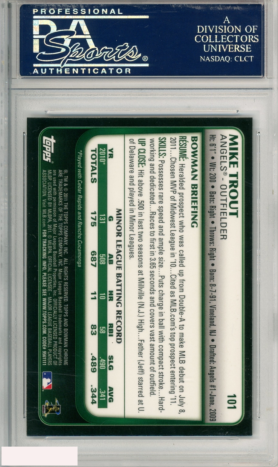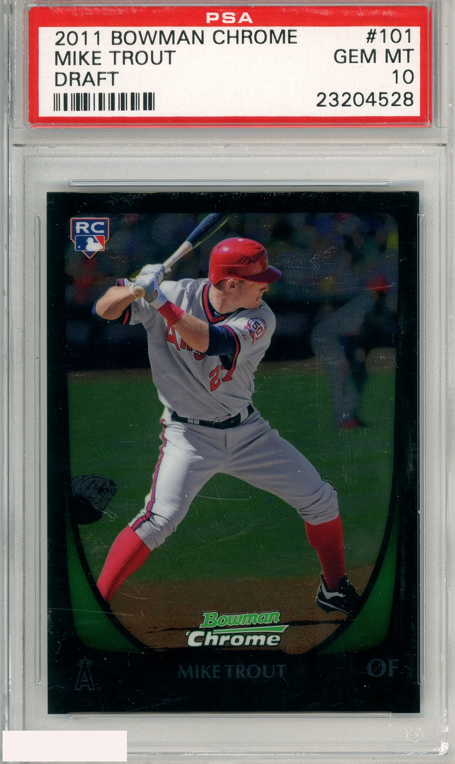 CERT NUMBER - 23204528 LABEL TYPE - PREVIOUSLABEL YEAR - 2011 BRAND - BOWMAN CHROME DRAFT CARD NUMBER - 101 PLAYER - MIKE TROUT VARIETY - DRAFT CARD GRADE - 10 GRADE DESC - GEM MT GRADED - YES ORIGINAL TEAM - CALIFORNIA ANGELS CONDITION - GEM MINT RC ROOKIE