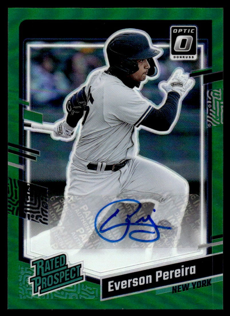 Feast your eyes on this outstanding offering - the 2023 Panini Donruss Optic Everson Pereira Rated Rookie Green Prospect 5/5 Auto. This gem, bearing the Card Number RPS-EP, is a true collector's dream and a testament to the exceptional quality of Donruss Optic brand of sports cards. This card is not just another piece of sports memorabilia but a piece of sports history. It showcases Everson Pereira, a name that has made a mark in the sports world. The card's shimmering green finish makes it a stand-out piece, while the 'Rated Rookie' label adds to its exclusive appeal, making it a must-have for any serious collector. The card's 5/5 rating signifies its top-tier quality and rarity, making it a highly sought-after piece. The autograph on this card adds an extra layer of authenticity and personal touch from Pereira himself, enhancing its appeal and value. Meticulously preserved in pristine condition, this card is a fantastic representation of Donruss Optic's commitment to delivering high-quality, visually stunning sports cards. With its vibrant colors, sharp corners, and crisp, clear image, it's a remarkable addition to any collection. In summary, the 2023 Panini Donruss Optic Everson Pereira Rated Rookie Green Prospect 5/5 Auto is more than just a card. It's a tangible piece of sports history that celebrates one of the promising rookies of his time. This is a must-have card for any serious collector or sports enthusiast. Don't miss your chance to own this incredible piece of memorabilia!