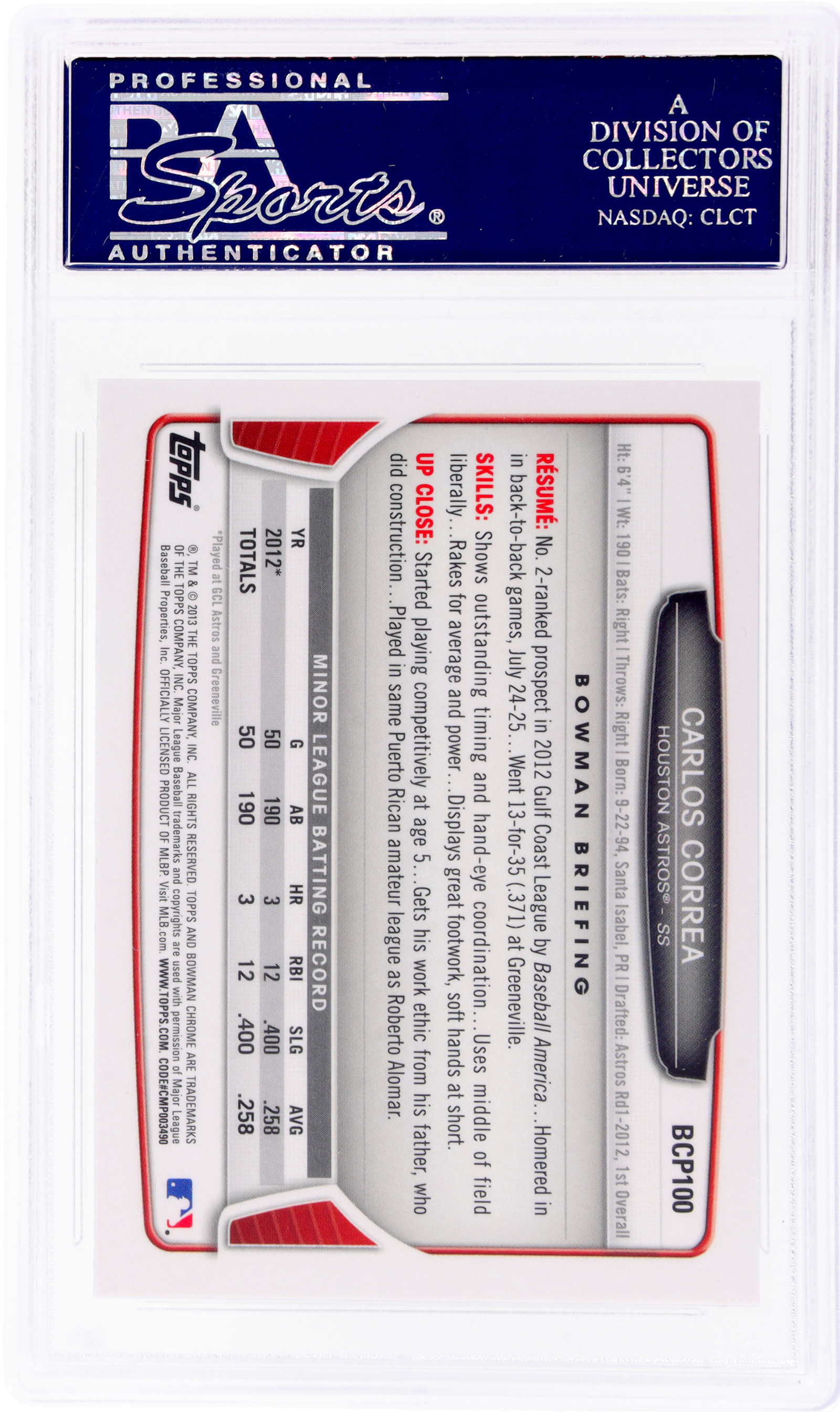 Step into the big leagues with this remarkable 2013 Bowman Chrome Prospect Carlos Correa #BCP100 PSA 10 card. An absolute jewel for collectors, this card is a testament to Correa's undeniable talent and potential as one of baseball's brightest stars. With its pristine PSA 10 grading, this card stands in the pinnacle of quality, offering you a flawless piece of sports history. Bowman, a trusted brand among card enthusiasts, is renowned for its high-quality card production, and this card is no exception. It showcases Correa in his early days, capturing the essence of his career's inception with striking clarity and vibrant colors that have been preserved perfectly over the years. The card number BCP100 marks it as a unique asset in any collection, providing a sense of exclusivity that only true sports memorabilia can offer. This card is more than just a piece of cardboard, it's a tangible connection to Correa's journey in the world of professional baseball. Invest in a piece of sports history, invest in the 2013 Bowman Chrome Prospect Carlos Correa #BCP100 PSA 10 card. Whether for the love of the game, the player, or the thrill of collecting, this card is a must-have addition to any sports card collection. Don't miss out on owning this exceptional piece of baseball royalty.