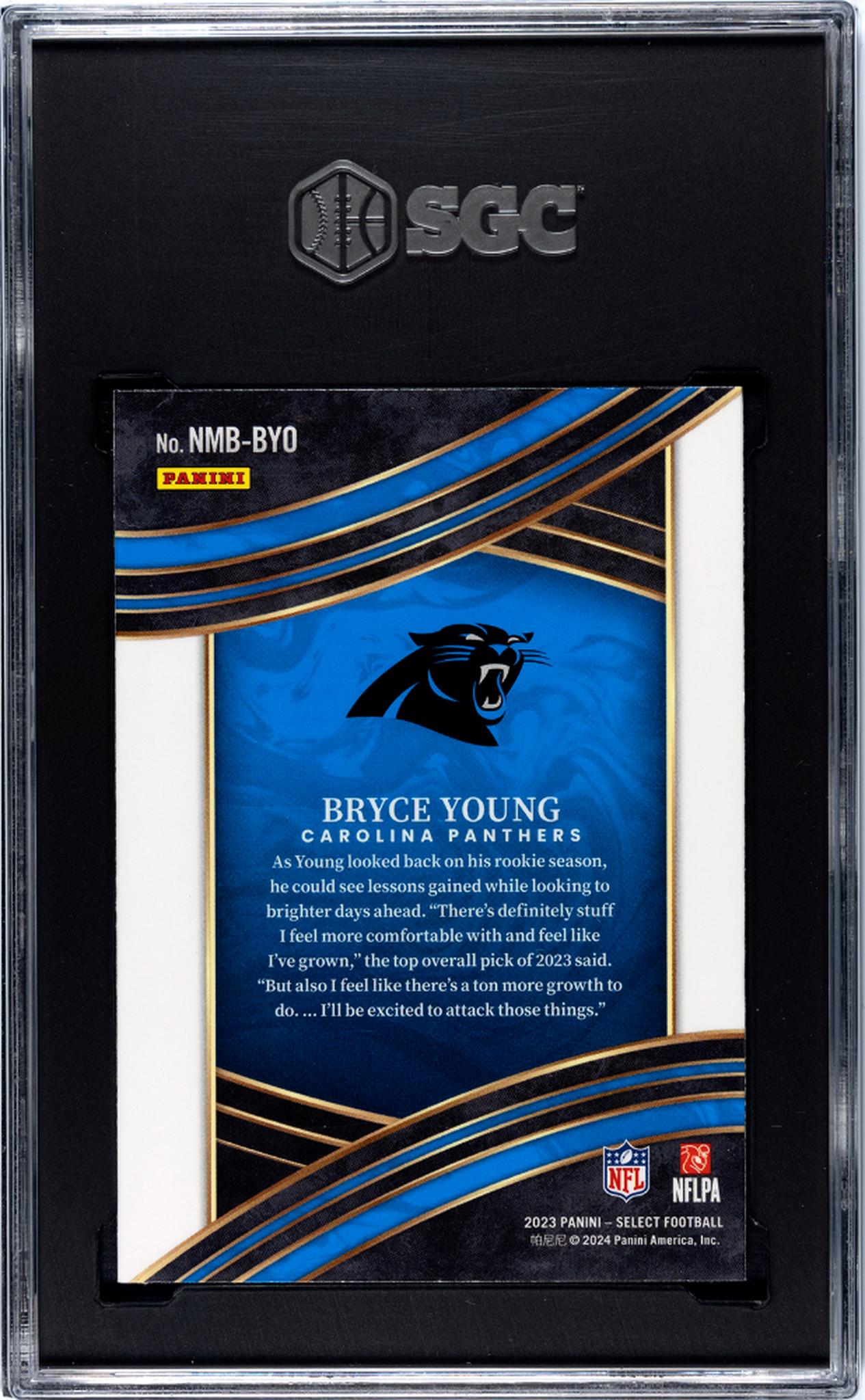Immerse yourself in the excitement of football memorabilia with this exquisite Bryce Young rookie card! Manufactured by the esteemed Panini, and belonging to the 'Select' brand, this card is from the 2023 series and carries the distinguished card number 'NMB-BYO'. It is a part of the 'Numbers' insert set, a collection highly sought after by collectors and enthusiasts alike. This card showcases Bryce Young, the phenomenal player from the Carolina Panthers. As a rookie card, it holds a special place in the NFL collectibles, capturing the beginning of his journey in the league and promising immense potential for value appreciation. The card is professionally graded by the renowned SGC and boasts an impressive grade of 8.5, indicative of its near-mint to mint condition. This ensures that the card you're acquiring is of top-tier quality, well-preserved, and is an asset to any collection. Adding to its allure, the card belongs to the 2023 'Select Football' set, a set celebrated for its premium quality and design. As an NFL collectible, this card is not just a piece of sports memorabilia but a slice of football history that encapsulates Bryce Young's promising career. With key features such as its rookie status, association with the Carolina Panthers, inclusion in the 2023 Select series, and a Numbers insert, this card is a must-have for any sports card aficionado. Own this piece of sports history and enjoy the thrill of possessing a card that celebrates a rising star in the NFL universe. Don't miss out on this opportunity to add this extraordinary sports card to your collection.