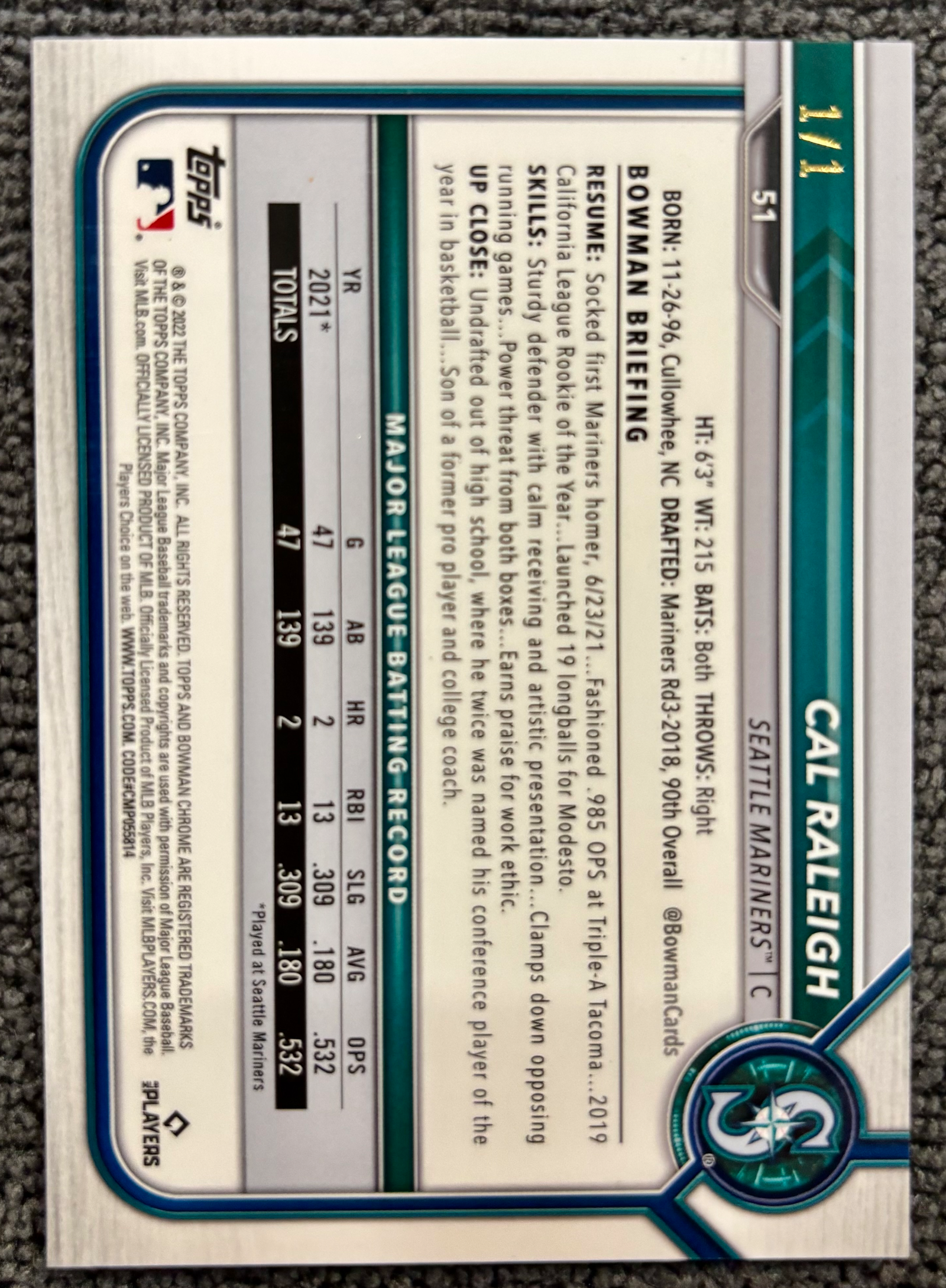 2022 Bowman Chrome Cal Raleigh Superfractor 1/1 RC #51