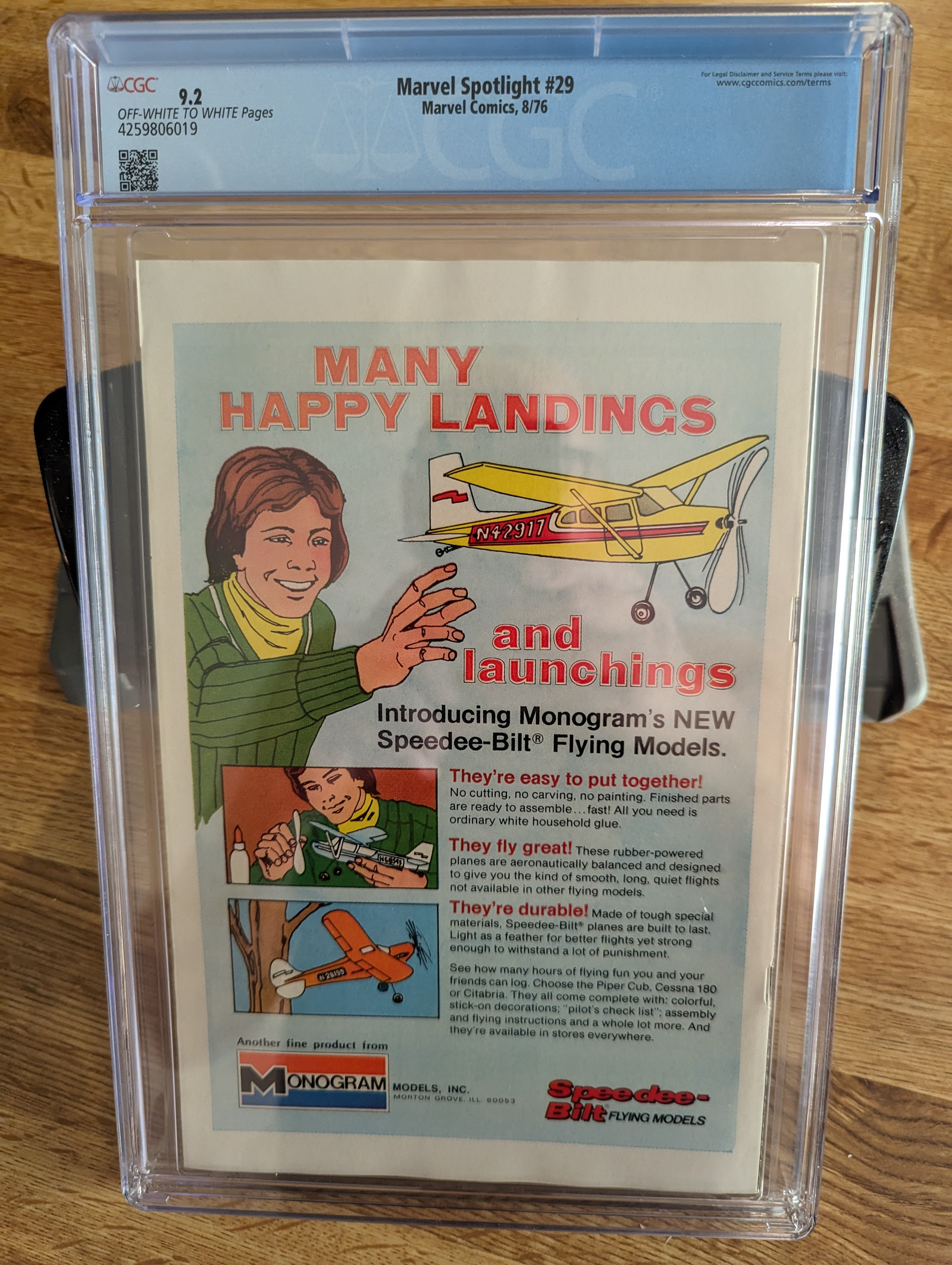 For Sale is a 1976 Marvel Spotlight Moon Knight #29 conservatively Graded by PSA as CGC 9.2. 2nd Moon knight appearance. Featuring: Doug Moench Story, Don Perlin Art, & Jack Kirby & Don Milgrom Cover.