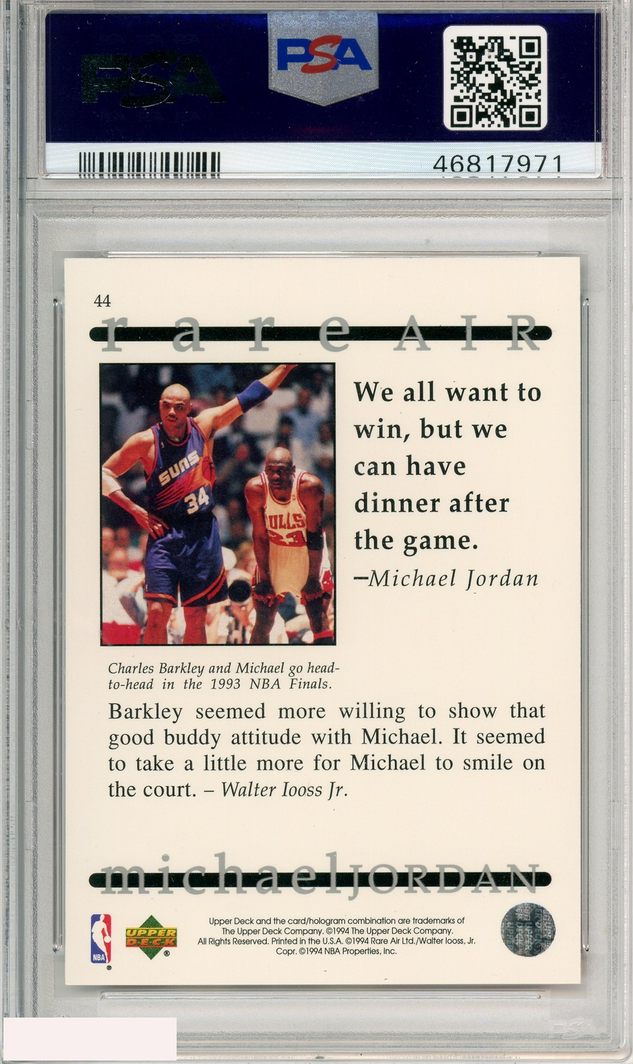 CERT NUMBER - 46817971 LABEL TYPE - LIGHTHOUSELABEL YEAR - 1994 BRAND - UPPER DECK MJ RARE AIR CARD NUMBER - 44 PLAYER - MICHAEL JORDAN VARIETY - RARE AIR CARD GRADE - 10 GRADE DESC - GEM MT GRADED - YES ORIGINAL TEAM - CHICAGO BULLS CONDITION - GEM MINT