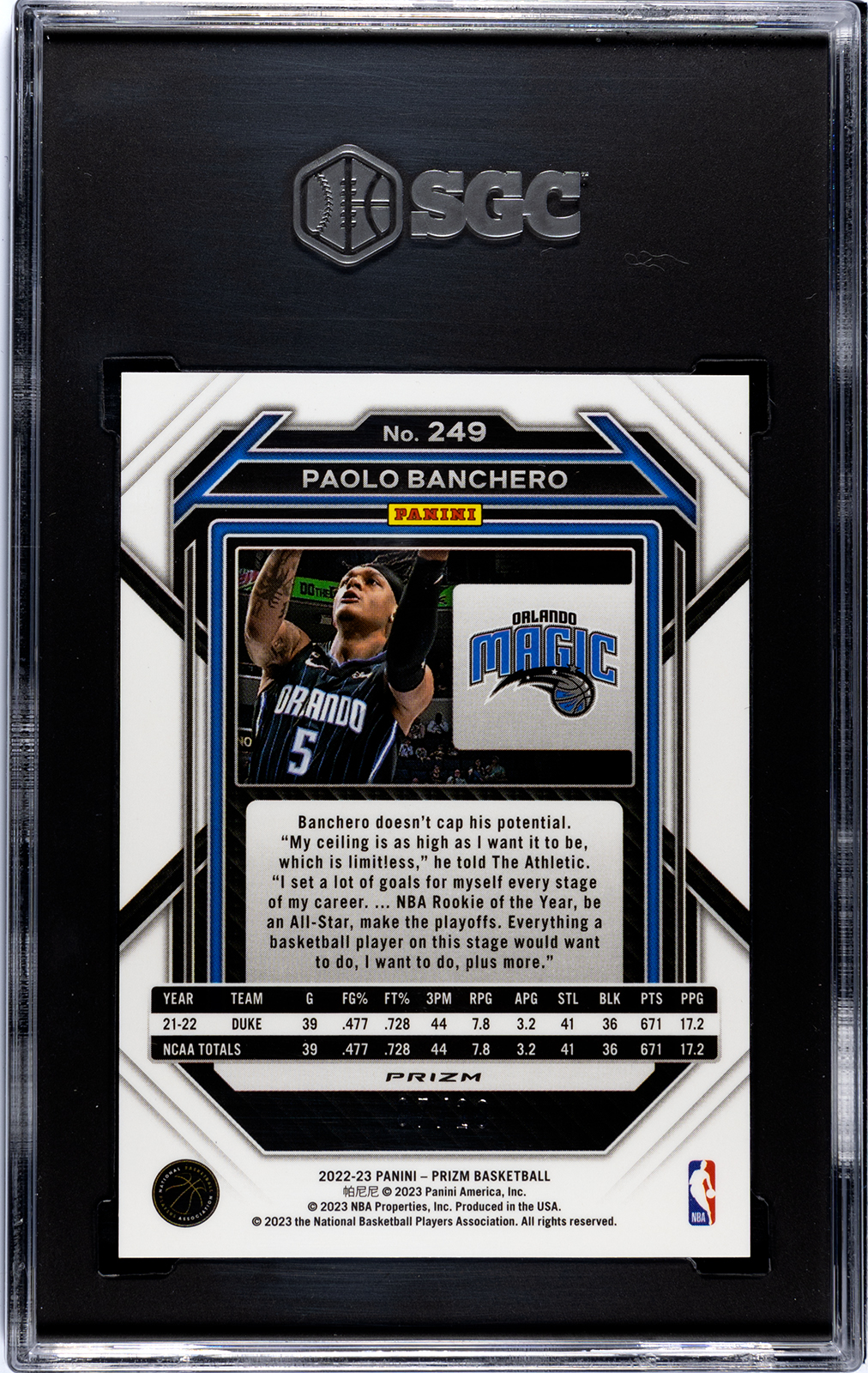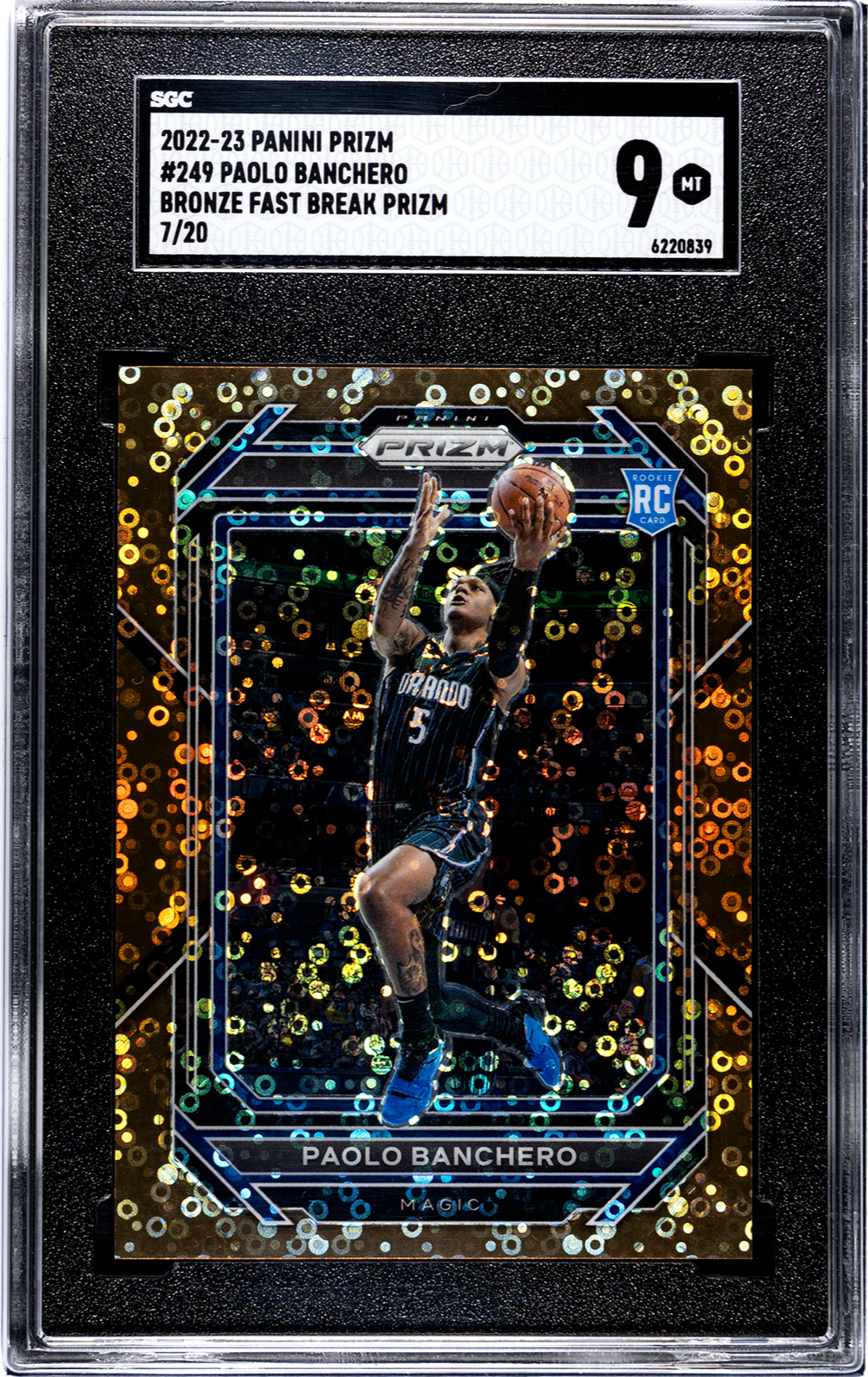 2022β23 Prizm Fast Break Paolo Banchero Rookie β Bronze 7/20 β SGC 9 Grading Company: SGC Grade: 9 (Mint) Card #: 249 Parallel: Fast Break Bronze β Serial-Numbered /20 π₯ Why This Card Matters: Scarcity: Only 20 copies of this Bronze Fast Break rookie exist! Youβre looking at one of the rarest and most sought-after Banchero parallels on the market. The Bronze fast break rookies for players with unlimited potential like Banchero will only drive the value of this card higher. Look at what this card is going for on other platforms!