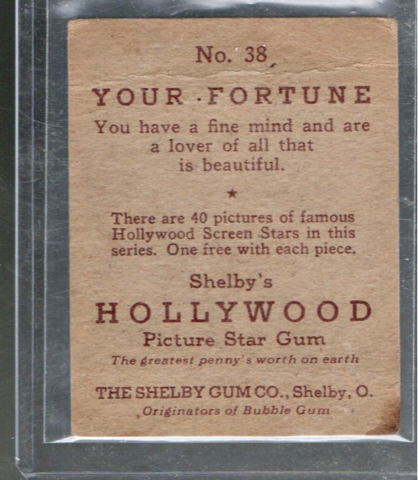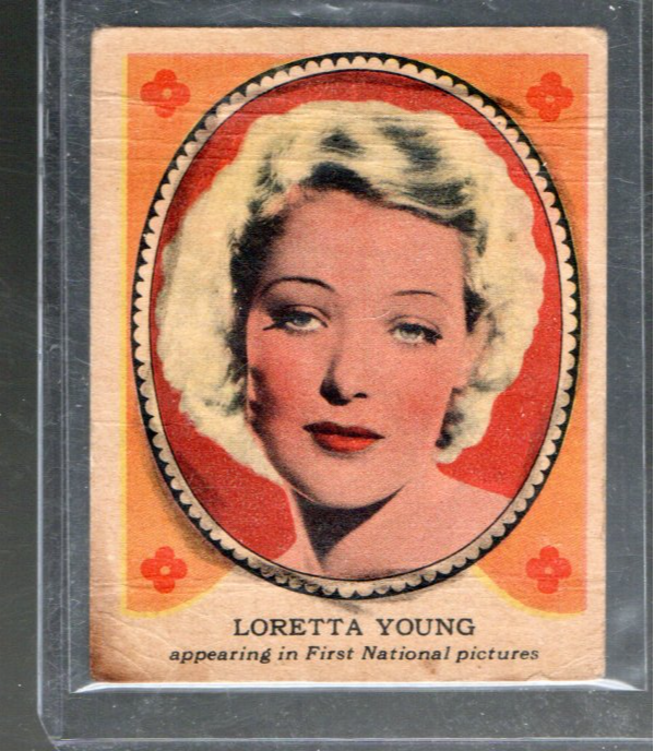 R68 1938 Shelby Hollywood Picture Stars #38 Loretta Young VG or so with some front top surface creasing. Shipping for a Single Card is $5.