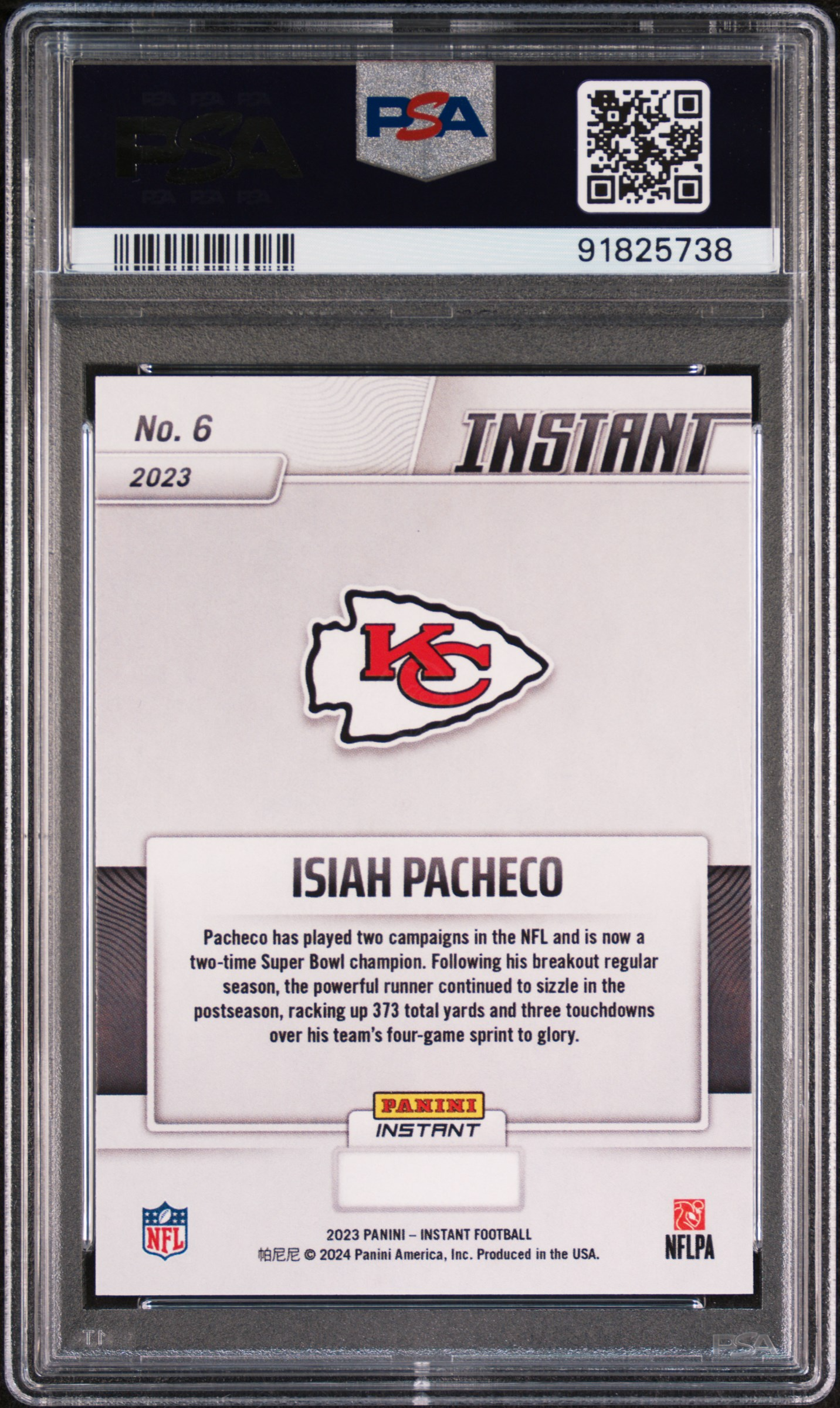 Enhance your sports memorabilia collection with the Isiah Pacheco 2023 Panini NFL Superbowl Champions #6 Card PSA 10 Gem Mint. This stunning card has been graded a PSA 10 Gem Mint, ensuring its top quality and value. Celebrate the Superbowl Champions with this rare and coveted card featuring Isiah Pacheco. Add this gem to your collection today and relive the excitement of the championship season!