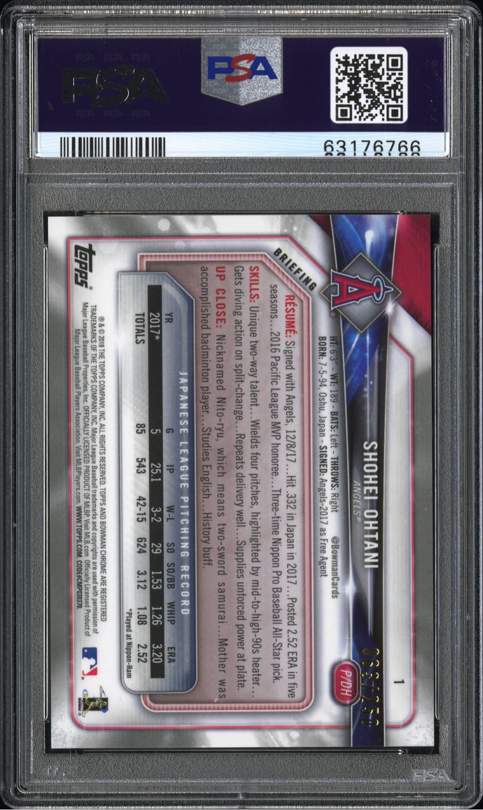 2018 BOWMAN CHROME SHOHEI OHTANI PURPLE REFRACTOR #1 ROOKIE PSA 10 GEM MINT /250