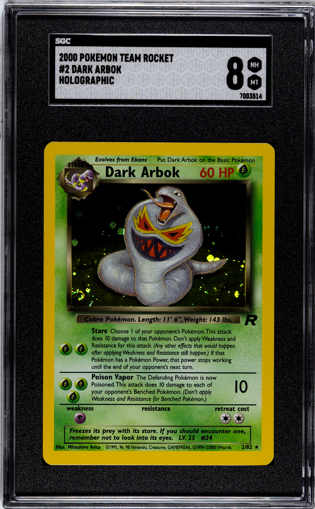 Presenting a stunningly captivating collectible, the 2000 Pokemon Team Rocket #2 Dark Arbok Holographic card. This remarkable card, professionally graded an SGC 8, is a true testament to the quality and care taken in preserving it. The holographic finish of the Dark Arbok, a fan-favourite Pokemon, brings an unparalleled depth and allure to the card. The Team Rocket brand is synonymous with rarity and quality, making this card an incredibly sought-after piece for both seasoned collectors and Pokemon enthusiasts alike. The card's striking aesthetics are matched by its significance in the Pokemon universe, making it a standout addition to any collection. This card is not just a piece of Pokemon history but a tangible asset that resonates with the nostalgia of the early 2000s. Don't miss out on this opportunity to own a piece of Pokemon Team Rocket legacy, a treasure that continues to appreciate with time. It's more than just a card, it's an investment in a piece of pop culture.