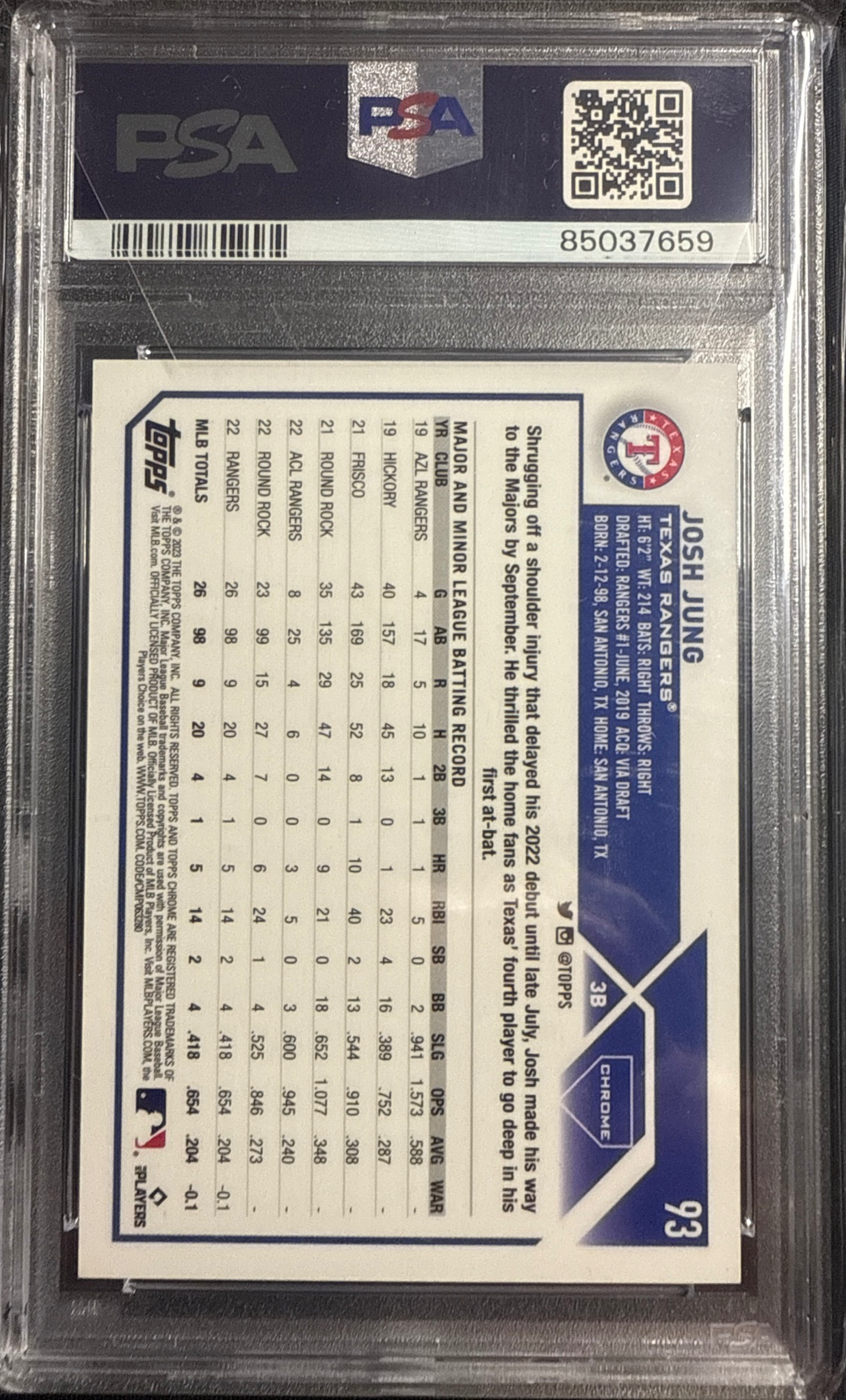 🔥 For Sale: PSA 10 2023 Topps Chrome L/E #93 “Yellow” Josh Jung Rookie Card, graded GEM MT by PSA. This vibrant limited-edition parallel is numbered to just 75 and showcases the Texas Rangers’ rising prospect in chrome brilliance. Carefully stored in a top-loader and sleeve since grading—perfect for collectors or investors.