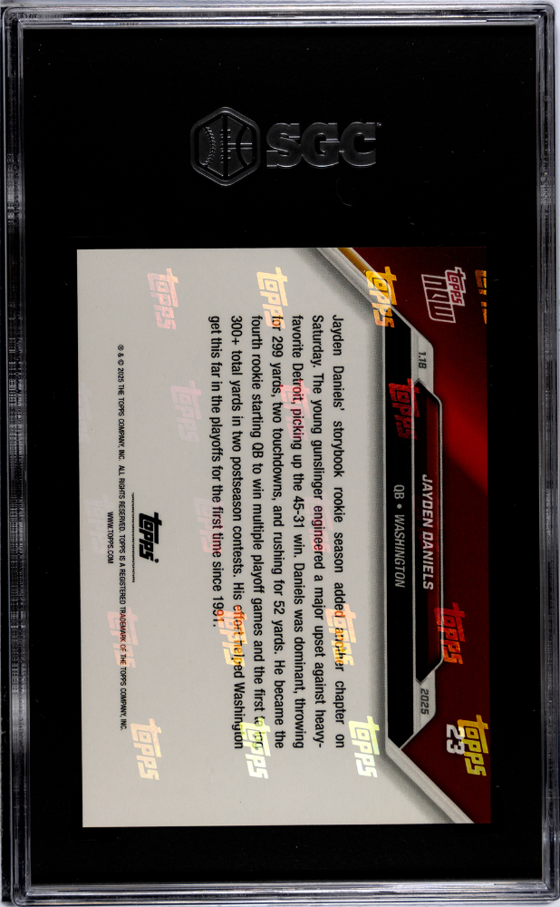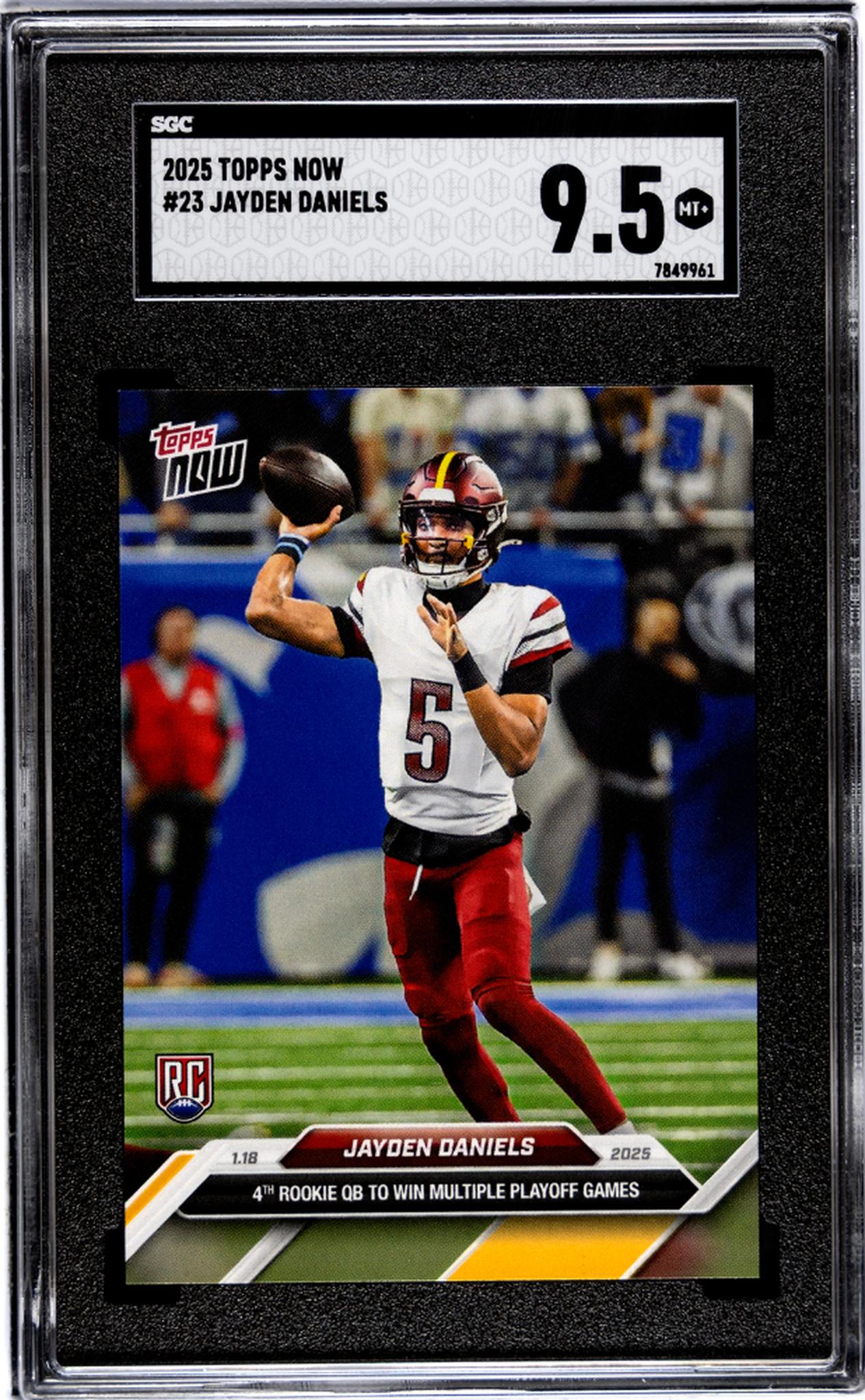 Marvel at the magnificent 2025 Topps Now #23 Jayden Daniels rookie card! This card is a perfect addition to any sports card collection, whether you're a seasoned collector or just starting out. Manufactured by the esteemed Topps, this card is part of the exclusive 'Topps Now' collection from 2025, a series that has made waves in the sports card industry. The card features Jayden Daniels, a dynamic player from the Washington team, in the prime of his career. The vibrant print quality and crisp imagery truly capture the essence of this rising star, rendering it a must-have for all football enthusiasts. What sets this card apart is its professional SGC grading of 9.5, a clear testament to its impeccable condition. It is defined as 'Mint', meaning it's virtually flawless, with sharp corners, perfect edges, and brilliant color. The professional grading not only adds to its value but also guarantees its authenticity and condition. This card is a tribute to Daniels' historic playoff achievement, a moment that has been immortalized in this collectible. It doesn't bear an autograph or memorabilia, but it doesn't require these to stand out. Its intrinsic value lies in its flawless condition and the significant moment it represents. Add this 2025 Topps Now #23 Jayden Daniels card to your collection and revel in the history it encapsulates. This isn't just a card; it's a tangible piece of football history. Don't miss out on the opportunity to own this remarkable collectible!