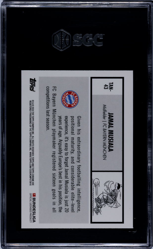 Step into the exciting world of soccer with this exceptional sports card featuring the stellar player Jamal Musiala of the FC Bayern Munchen team. Produced by the renowned manufacturer Topps, this card is a part of the Topps Chrome Bundesliga '63 Design set, taking you back to the golden era of sports with the nostalgic '63 Topps Design. The card, numbered TAN-43, is not just any piece of memorabilia; it's a testament to Musiala's skill and dedication in the demanding Bundesliga league. While this card may not be a rookie or autographed, it doesn't detract from the value it brings to any collection. What makes this card particularly special is that it has been professionally graded by the prestigious SGC and has achieved the perfect numeric grade of 10. Described as 'Gem Mint', it is in impeccable condition, preserving the quality and integrity of the card for years to come. This 2023-24 Topps Chrome TAN-43 Jamal Musiala card does not include any memorabilia or parallel, focusing solely on the player and his impressive career. The card caters to the soccer category, fitting seamlessly into any sports card collection, big or small. In conclusion, this Jamal Musiala card is more than just a sports card; it's a piece of history, a symbol of a player's journey, and a great investment for any soccer enthusiast. Adding this to your collection would certainly enhance its prestige and charm.