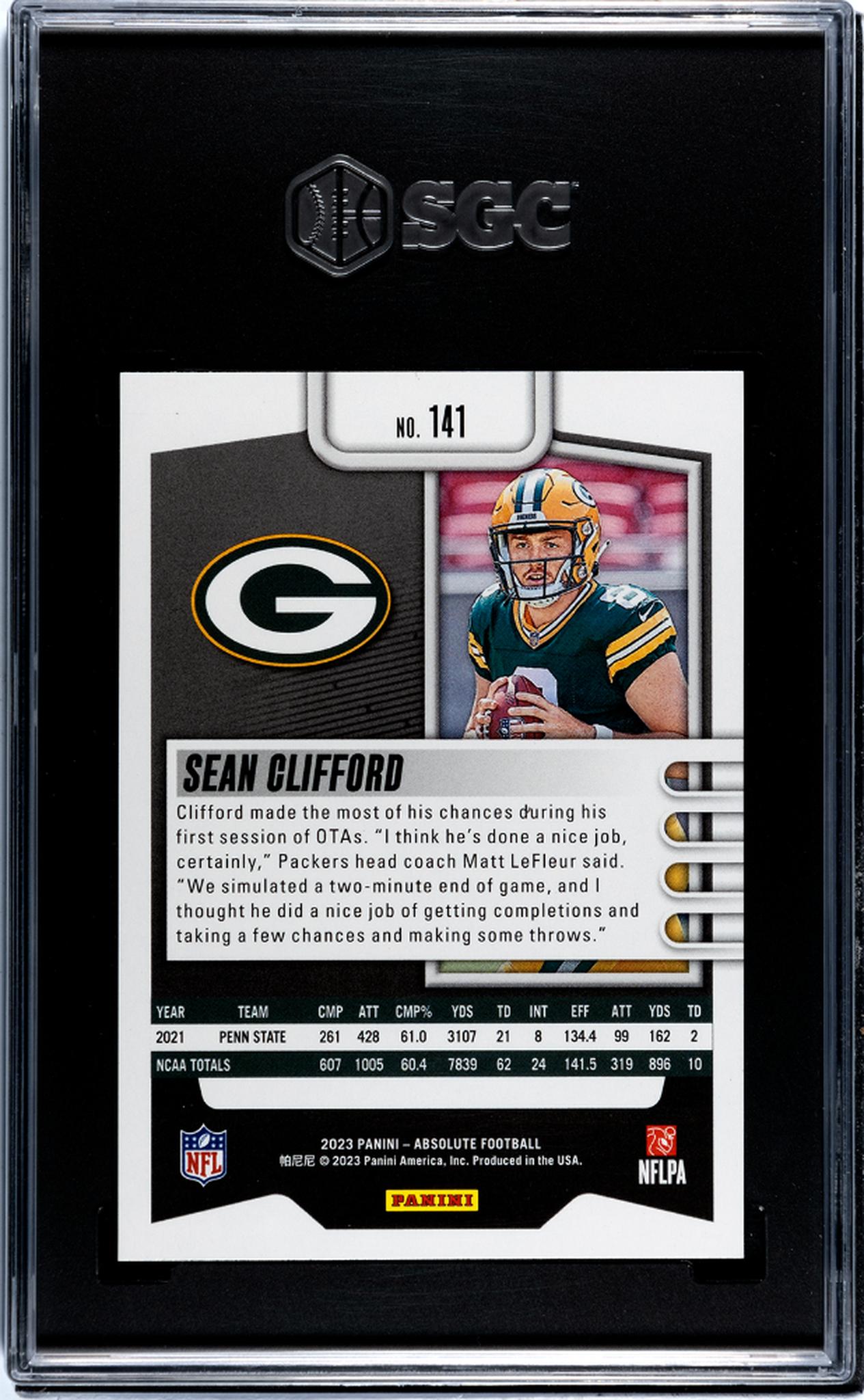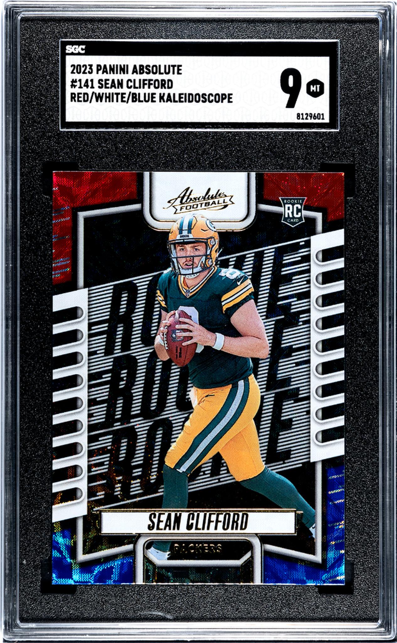 Immerse yourself in the captivating world of sports card collecting with this magnificent Sean Clifford card from the esteemed Panini Absolute Football 2023 set. Proudly presenting card #141, this striking piece captures the vibrant energy of this Packers' star player with a Red/White/Blue Kaleidoscope parallel that truly sets it apart from the rest. Manufactured by the highly-regarded Panini and part of their 'Absolute' brand, it's a stellar addition to any NFL collector's portfolio. This card is unautographed, unserial numbered, and is not a parallel card, making it a pure representation of Clifford's prowess on the football field. The card is in Mint condition (MT) and has been professionally graded 9 by the reputable SGC grading company. As a testament to its excellent preservation, this card is a tangible piece of sports history that you can hold in your hands. What makes this card particularly appealing is its key features: it's a Rookie card of Sean Clifford, has a Red/White/Blue Kaleidoscope parallel, and has been Graded Mint 9 by SGC. The card truly encapsulates the spirit of the game and the heart of competition. Whether you're a long-time Packers fan, an admirer of Sean Clifford's skills, or a dedicated card collector, this 2023 Panini Absolute #141 Sean Clifford SGC 9 card is a must-have in your collection. Its captivating design, exceptional condition, and the prestige of the Panini brand come together to create a sports card of undeniable allure. Don't miss the chance to own this piece of football history. It's not just a card, it's a conversation starter, an investment, and a token of admiration for the sport we all love.