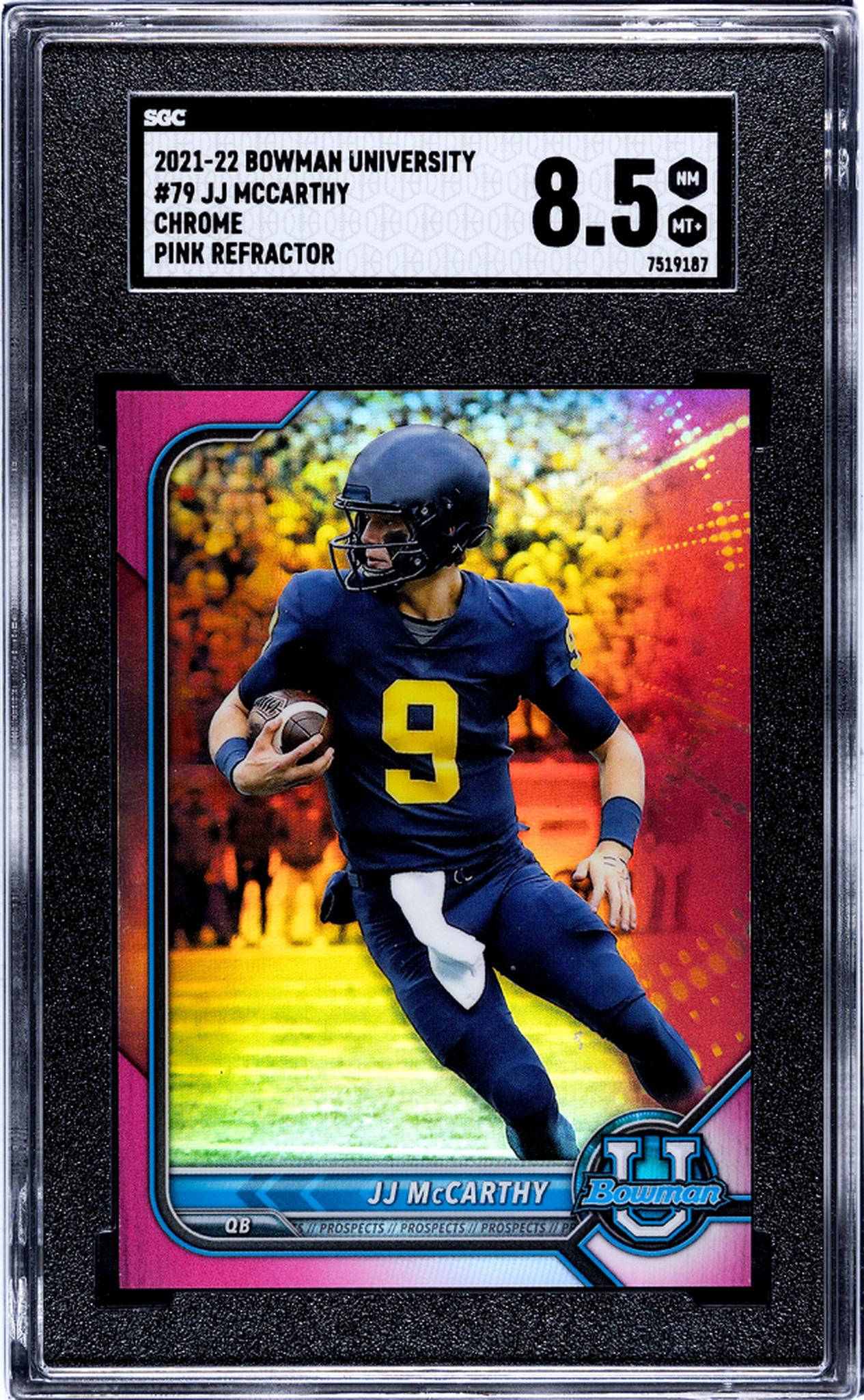 Welcome to an exceptional opportunity to own a piece of sports history! Presenting the 2021-22 Topps Bowman University Chrome, Card Number 79 featuring the promising young talent, JJ McCarthy. This isn't just any card; it's a Bowman Chrome Rookie Card! A must-have addition for any serious collector, this card showcases the early career of a rising star in football. It's not everyday you find a gem like this, making it an essential piece to complete or enhance your collection. What sets this card apart? It's a Pink Refractor! The vibrant shimmering pink hue offers a unique twist on the classic chrome finish, adding an extra layer of allure and rarity. This card is not only visually appealing, but it also stands out from the crowd, making it a sure conversation starter. This card comes professionally graded by SGC, with a notable grade of 8.5 and a condition description of NM-MT. This high-grade assurance reflects its excellent condition, preserving the integrity of the card while enhancing its value and collectability. Moreover, the card is not autographed, nor does it include any memorabilia; its true value lies in its status as a rookie card of a promising player. Bowman is a trusted brand known for its high-quality sports cards and this card is no exception, offering a perfect blend of style and substance. In summary, this 2021-22 Bowman #79 JJ McCarthy Chrome Card is a remarkable find for any sports card enthusiast, football fan, or collector. Its unique features such as its Pink Refractor status, professional SGC grading, and rookie card status of JJ McCarthy make it a highly desirable and valuable addition. Don't miss out on the chance to own this spectacular piece of sports history!