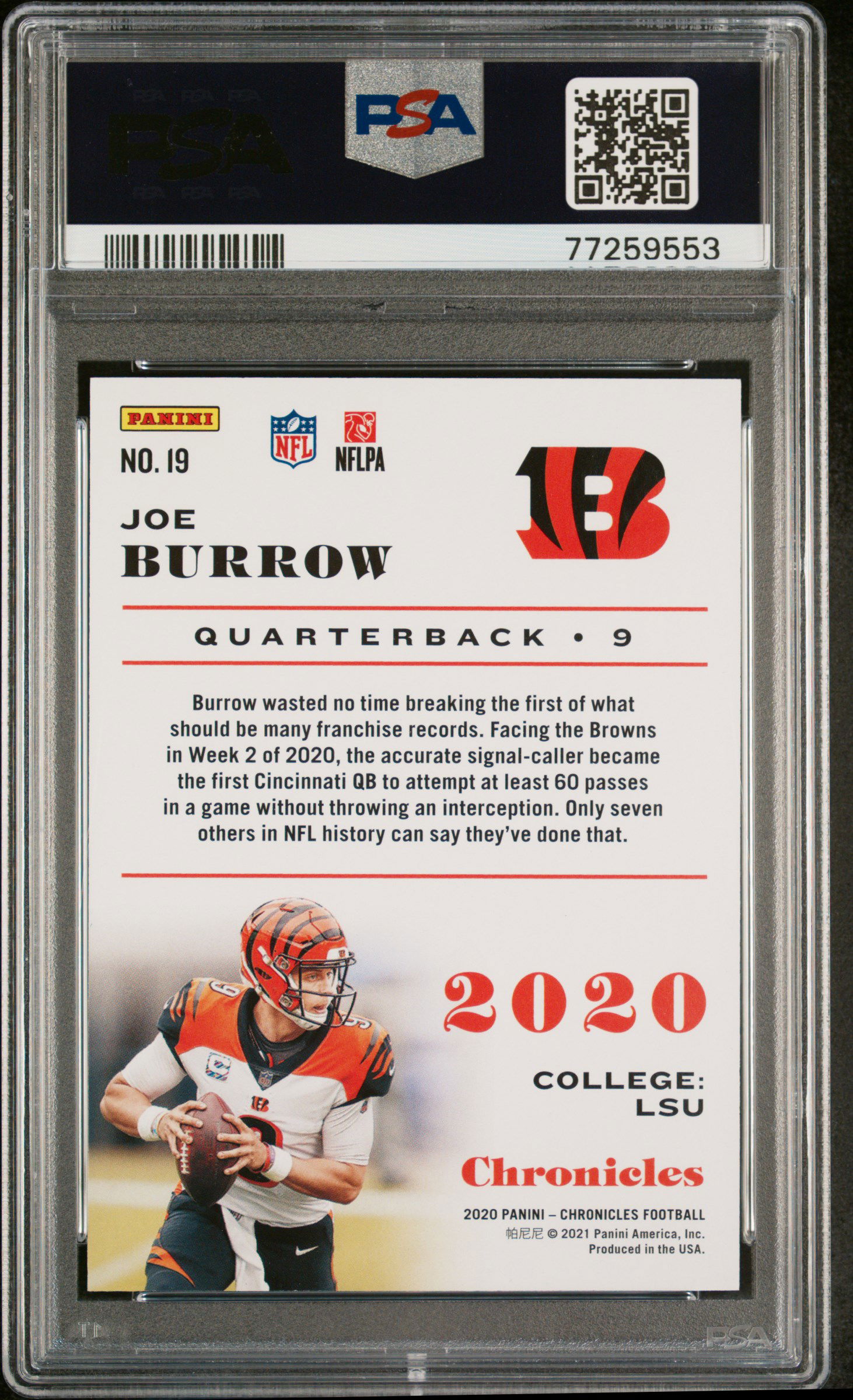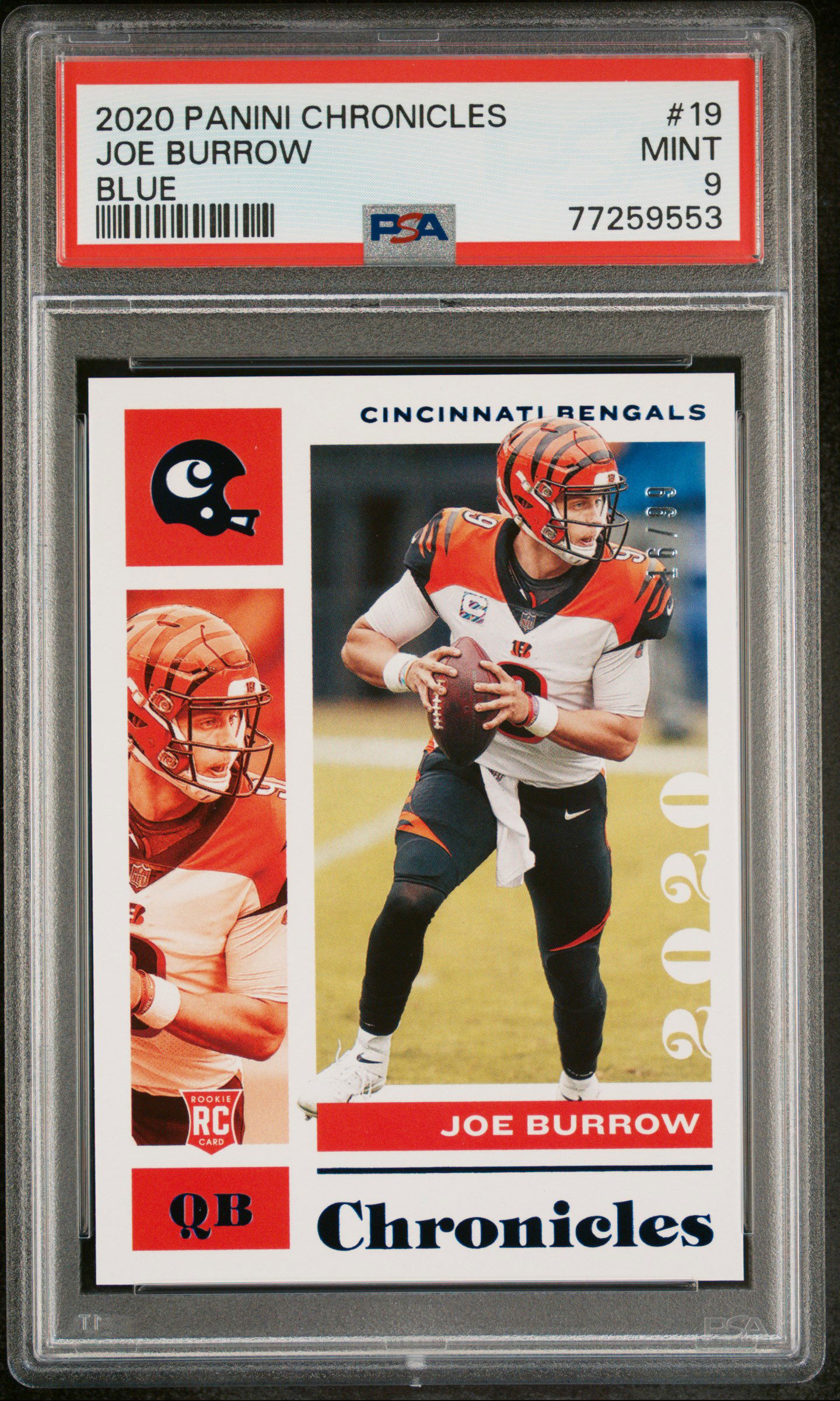 Behold, the gem of your collection - the 2020 Chronicles #19 Joe Burrow Blue! This card is more than just a piece of paper, it's a testament to the Cincinnati Bengal's rising star's stellar rookie year in the NFL. Manufactured by the renowned Panini, the card is part of the acclaimed Chronicles set, celebrated for its quality and design. The card is not just any regular edition; it's a Blue Parallel, adding a unique touch to your collection. It's like holding a piece of history in your hands, one that's undeniably appealing to any ardent football fan. The card has been professionally graded by PSA, the leading authority in card grading, and has received a 9 rating, signifying it's in Mint condition. This is an absolute testament to its superior preservation and quality. It's a card that truly embodies the spirit of the game, and the potential of its star, Joe Burrow. This card is more than just a collectible, it's an investment. As the years go on and Burrow's career progresses, this card is poised to appreciate in value. It's a tangible representation of the promising future of the NFL, shown by the players who are set to become the next generation of legends. Whether you're a die-hard Bengals fan, a Joe Burrow admirer, or a passionate sports card collector, this card is a must-have. Its key features including its rookie status, blue parallel, mint condition, and NFL category make it a standout addition to any collection. Don't miss out on the opportunity to own this exceptional piece of sports history. Enhance your collection today with the 2020 Chronicles #19 Joe Burrow Blue - a card that's as unique and impressive as the player it represents.
