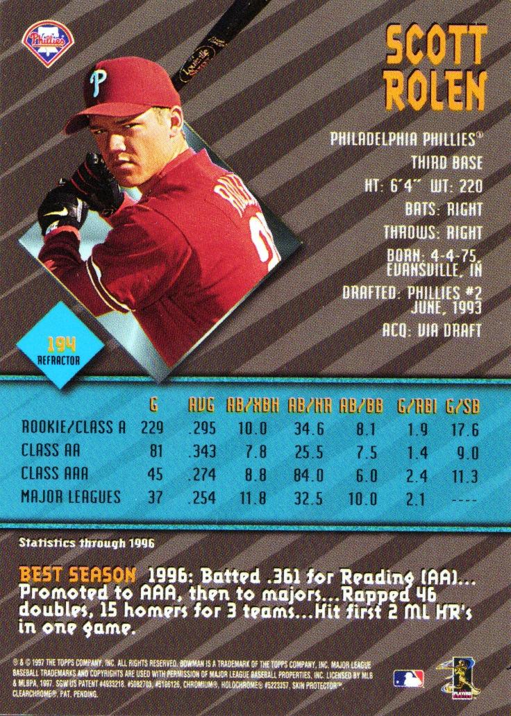 1997 BOWMAN'S BEST CERTIFIED AUTOGRAPH REFRACTOR # 194 SCOTT ROLEN HALL OF FAMER