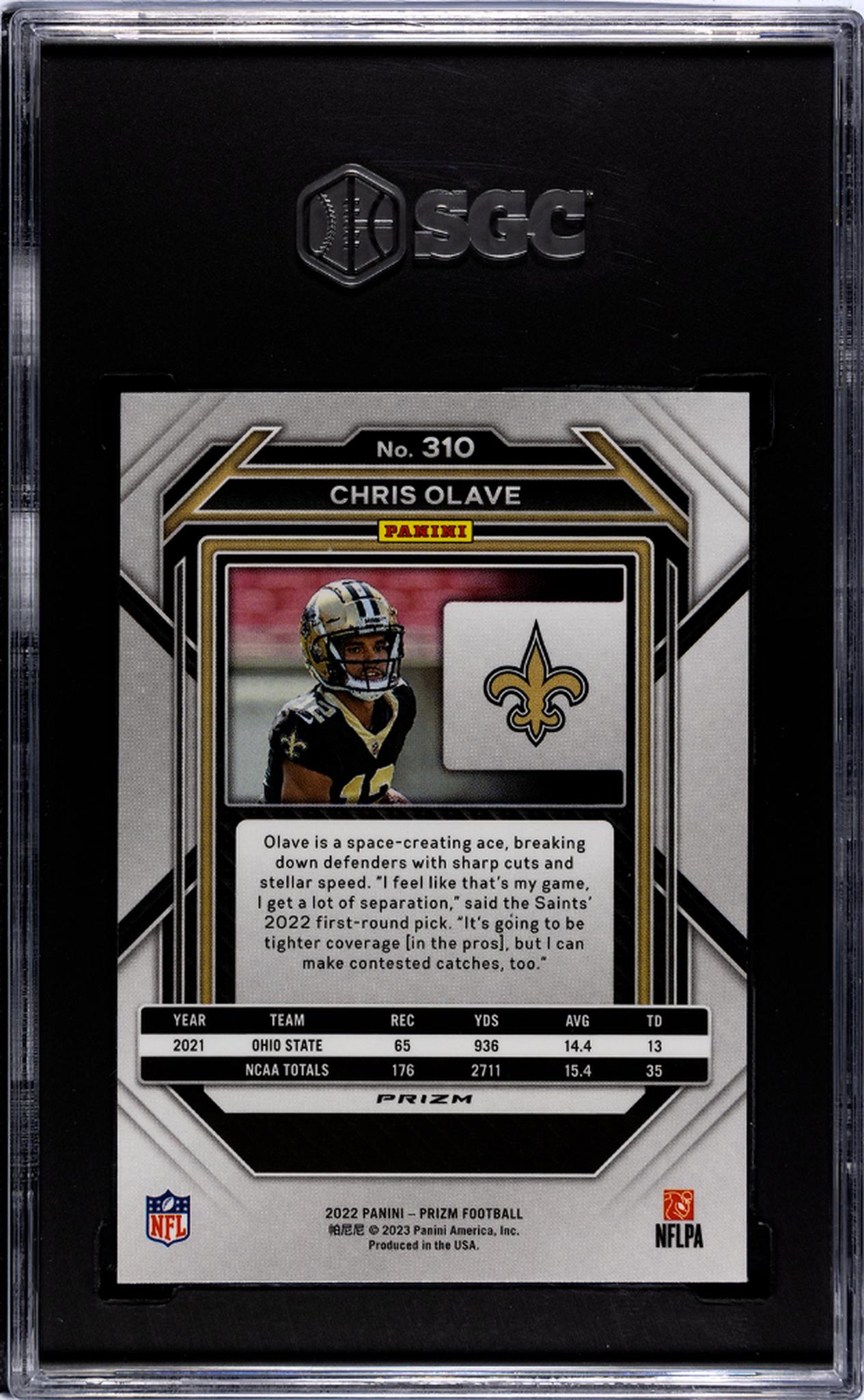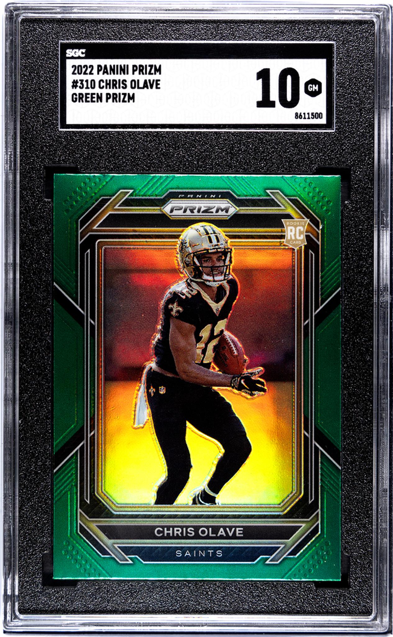 Step into the big leagues with this impeccable 2022 Panini Prizm #310 Chris Olave Green football card. This gem is a part of the esteemed Panini Prizm Football set and features the promising rookie Chris Olave of the NFL's Saints in a stunning Green Parallel edition. A true standout, this card has been professionally graded by the highly respected SGC and has achieved an outstanding Gem Mint 10 grade, certifying its top-tier condition. This card is a perfect testament to Olave's burgeoning prowess on the field and a fantastic addition to any collection. The card is not autographed, adding to its pristine condition, and does not include any memorabilia. Yet, it stands as a remarkable memento of Olave's rookie year, making it a must-have for any serious collector, Saints fan, or NFL enthusiast. Manufactured by Panini, a brand synonymous with quality and reliability, this card is a true reflection of their commitment to providing collectibles that stand the test of time. The card's vibrant green color and stunning graphics make it an eye-catching piece, making it a standout in any collection. In short, this 2022 Prizm #310 Chris Olave Green SGC 10 card is a marquee piece that truly encapsulates the excitement and potential of Chris Olave's rookie year. It's a perfect blend of sports history and collectible artistry, offering enduring value and endless enjoyment for the discerning collector. Don't miss out on the opportunity to own this exceptional piece of sports memorabilia.