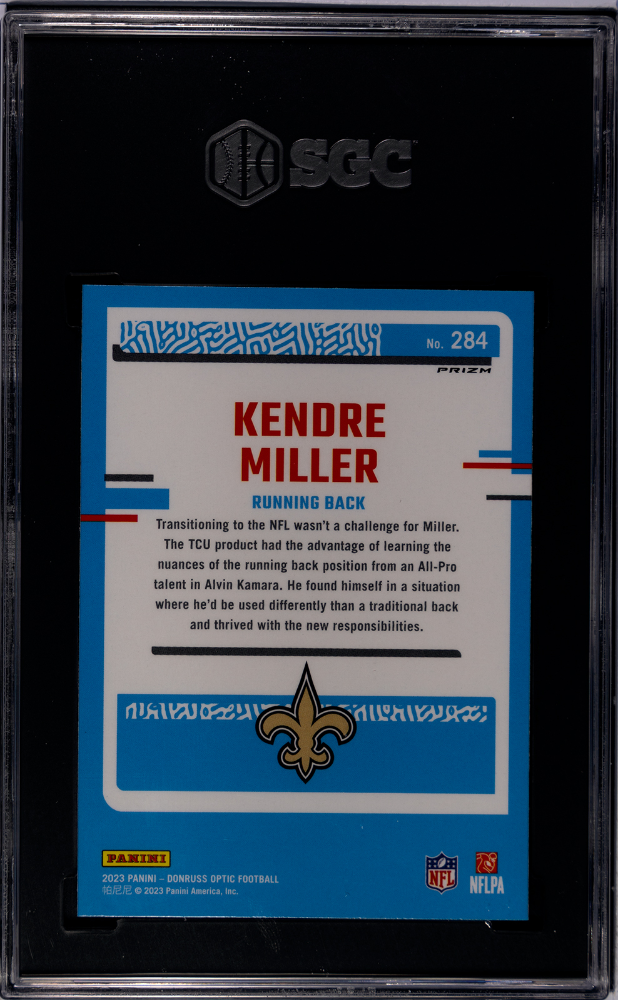 Delve into the world of NFL with the stunning Kendre Miller rookie card from the 2023 Donruss Optic Football Card Set! Exquisitely manufactured by Panini under the esteemed Donruss Optic brand, this card is a treasured addition to any collection. Garnering a perfect Gem Mint 10 grade from the trusted SGC grading company, this card's condition is impeccable, retaining its original vibrancy and flawless finish. The card number 284, titled 'Stars Prizm', is a parallel edition, a feature that enhances its desirability among collectors. It beautifully captures the spirit and dynamism of Kendre Miller, a promising talent from the New Orleans Saints. Its exceptional quality and unique attributes make it a noteworthy memento of his rookie year. This card does not feature an autograph or memorabilia, emphasizing the focus on Miller's memorable beginnings in the NFL. It stands out as a testament to his potential and the anticipation of his future stellar performances. Whether you are an avid Saints fan, a devoted collector of Donruss Optic cards, or a supporter of Kendre Miller, this card is a must-have. It is not just a card; it's a piece of NFL history, a spark of the thrilling games, and a tribute to the promising rookie Kendre Miller. Own it today and let the charm of NFL lore enrich your collection!