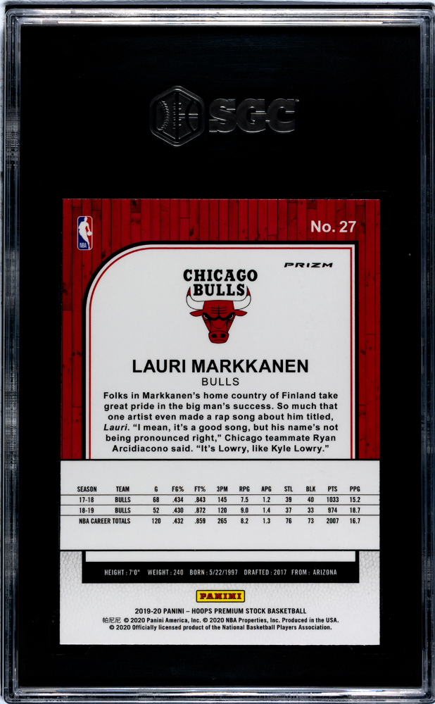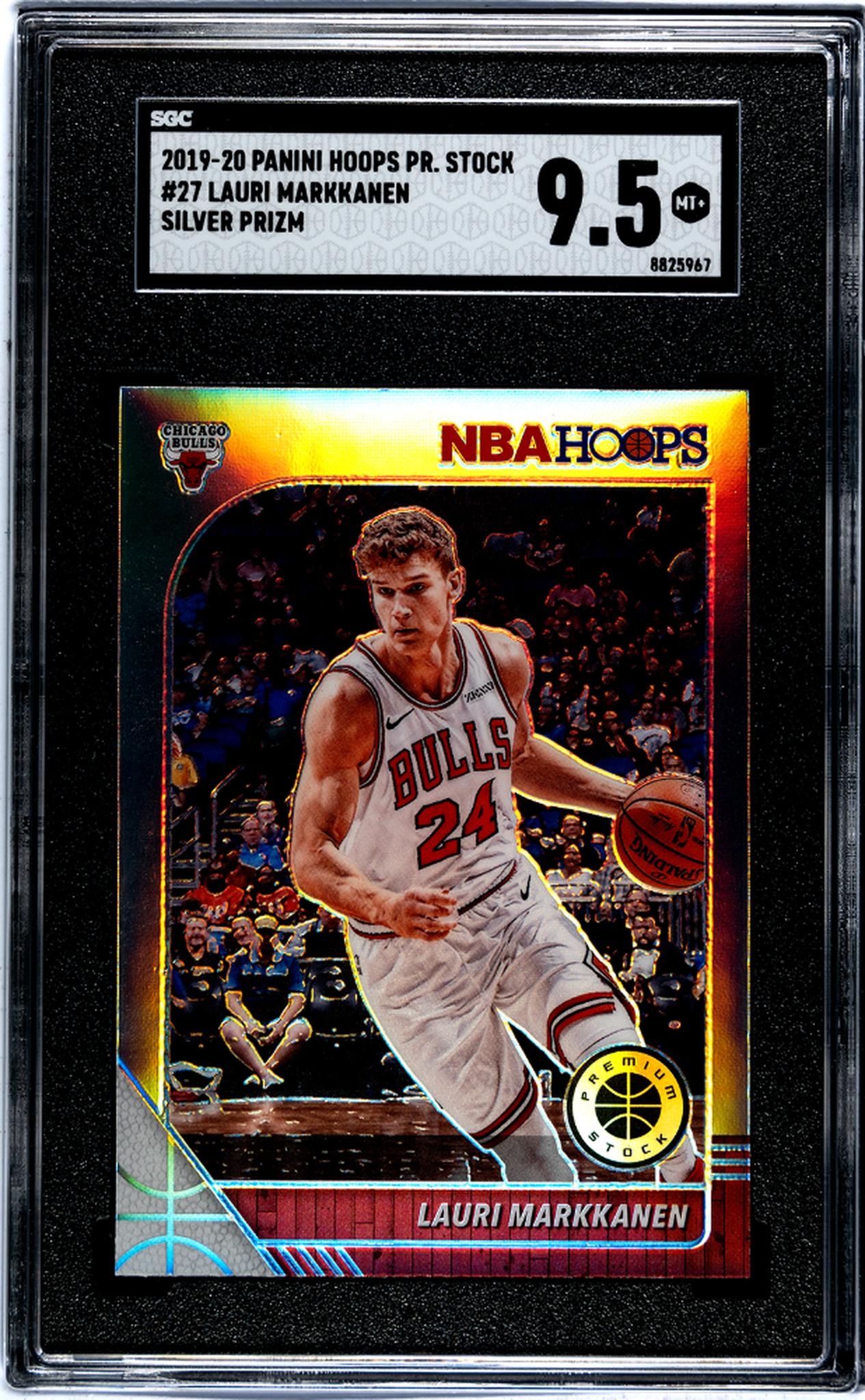 Step into the court with this exceptional 2019-20 Hoops #27 Lauri Markkanen sports card! Manufactured by the renowned Panini under their famous NBA Hoops brand, this card is a fantastic addition to any basketball card collection. From the Premium Stock set, this card features Lauri Markkanen, the dynamic player from the Chicago Bulls, showcasing his prowess in the NBA league. This striking card is not just any ordinary card, it's a Silver Prizm Parallel, offering a unique glimmer that sets it apart from others. This distinctive feature amplifies the card's aesthetic appeal, making it a must-have for collectors and NBA enthusiasts alike. Adding to its exceptional value, this card has been professionally graded by SGC, a reputable grading company in the industry, and has received a high numeric grade of 9.5, designating it as Mint+. This grade speaks to the card's superb condition and high quality, enhancing its desirability for those who seek only the best for their collections. Please note that this is not a rookie card and it doesn't carry an autograph or include any memorabilia. However, its key features such as the Silver Prizm parallel, the SGC 9.5 Mint+ grade, and the inclusion in the Premium Stock set, make it a notable piece of basketball card history. This Lauri Markkanen card is a testament to his significant role in the Chicago Bulls team and the larger NBA league. Whether you're a fan of Markkanen, the Bulls, or simply a basketball enthusiast, this card is the perfect choice for you. Don't miss out on the opportunity to own this impressive piece of NBA Hoops history!