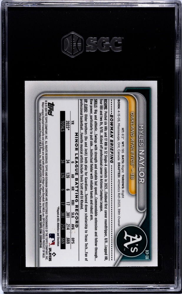 Behold this stunning 2024 Bowman Chrome #BCP-136 Myles Naylor Chrome Prospect /299 SGC 10! A true gem for any sports card collector. This pristine card, featuring rising star Myles Naylor, is a testament to the superior craftsmanship of the renowned Bowman Chrome series. With its flawless condition, it has been rated a perfect SGC 10. This card is a tangible piece of baseball history, with its sleek chrome finish and limited production run of just 299, adding an exclusive charm to your collection. Each detail of this card, from the vibrant colors to the intricate design components, reflects the spirit of the game and the promising career of Naylor. Don't miss out on this opportunity to own a piece of sports memorabilia that beautifully merges the past, present, and future of baseball. This is more than just a card - it's an investment in the legacy of the sport. Add this to your collection and be the envy of fellow enthusiasts.