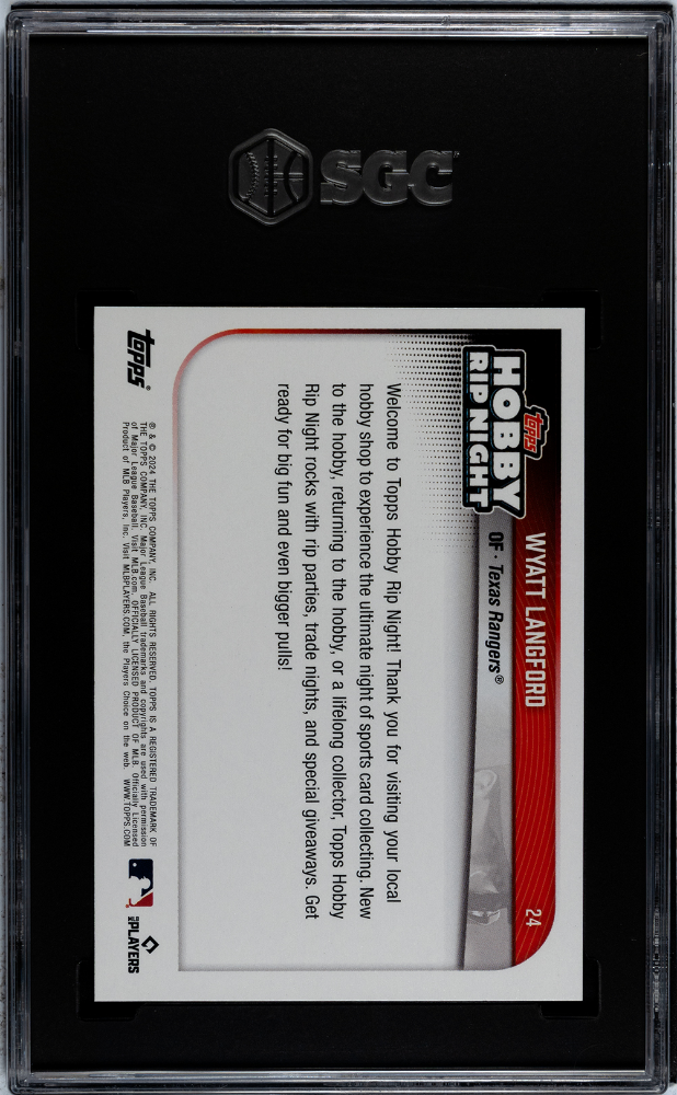 Feast your eyes on this fantastic find! Presenting the '2024 Topps Hobby Rip Night #24 Wyatt Langford Rookie SGC 9' card. Crafted by the prestigious 'Hobby Rip Night' brand, this card is a must-have for every sports card collector. This card features the emerging star Wyatt Langford in his rookie year, captured in an iconic pose. The card, numbered '24', is a testament to the athlete's prowess and potential on the field. Graded SGC 9, it is in near-perfect condition, preserving the excellent design and intricate details that have been meticulously put together by Topps. This card is truly a piece of sports history, encapsulating the early career of Wyatt Langford, and is sure to be a standout addition to any collection. Don't miss the opportunity to own this card, a perfect blend of sport and art that only increases in value over time. Perfect for the discerning collector, the sports enthusiast, or the fan who thinks they have everything. Secure this card today and be the envy of your fellow collectors!