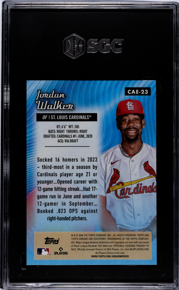 Behold the dazzling 2024 Topps Chrome #CAE-23 Jordan Walker All Etch! This card is a masterpiece from the esteemed Topps Chrome brand, revered by collectors worldwide. Gracing the front of this gem is the incredibly talented Jordan Walker, captured in stunning detail and etched to perfection. The card's pristine condition has earned it the highest grade of SGC 10, making it a coveted piece for any serious collector. The card's design brilliantly showcases Walker's athletic prowess, while the high-quality chrome finish adds an extra layer of elegance. Its unique number, CAE-23, signifies its authenticity, making this card a rare find. This Topps Chrome card is not just a collectible, but an investment, a piece of baseball history, and a testament to Jordan Walker's remarkable career. Whether you're a Jordan Walker fan, a Topps Chrome aficionado, or a sports card investor, this card is an absolute must-have. Its high-grade rating, stunning visuals, and the player's promising potential contribute to its tremendous value. Moreover, owning this card means you hold a piece of the sport's legacy in your hands. Don't miss the opportunity to add this incredible 2024 Topps Chrome #CAE-23 Jordan Walker All Etch SGC 10 card to your collection. Your portfolio will thank you!