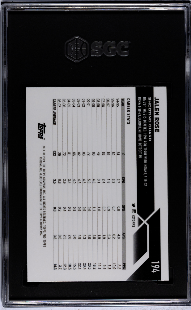 Unveiling an extraordinary gem from the world of sports cards, we present to you the phenomenal '2023 Topps Chrome #194 Jalen Rose /149 SGC 10'. This card is a true testament to the exceptional career of Jalen Rose, one of the most iconic figures in the basketball world. The card, with its unique number '194', stands out in the crowd, just like Rose did on the court. Crafted by Topps Chrome, a brand synonymous with quality and exclusivity in the sports card industry, this card is a must-have for any serious collector or sports enthusiast. Embodying the spirit of the game, every detail on this card has been meticulously designed. The quality of the card is second to none, as certified by the SGC 10 grading. This assures you of its pristine condition and impeccable quality, making it a valuable addition to your collection. The limited-edition card, with only 149 copies in existence, is the epitome of exclusivity. Owning this card is akin to owning a piece of sports history. The striking imagery and vivid colors bring back memories of Jalen Rose's spectacular performances, making it a tangible memento of his athletic prowess. In summary, this 2023 Topps Chrome #194 Jalen Rose /149 SGC 10 card is more than just a collectible. It's a celebration of basketball, a tribute to Jalen Rose, and a symbol of your passion for the sport. Don't miss out on the opportunity to make this rare and coveted card a part of your collection. This is not just a purchase, it's an investment in the rich history of sports!