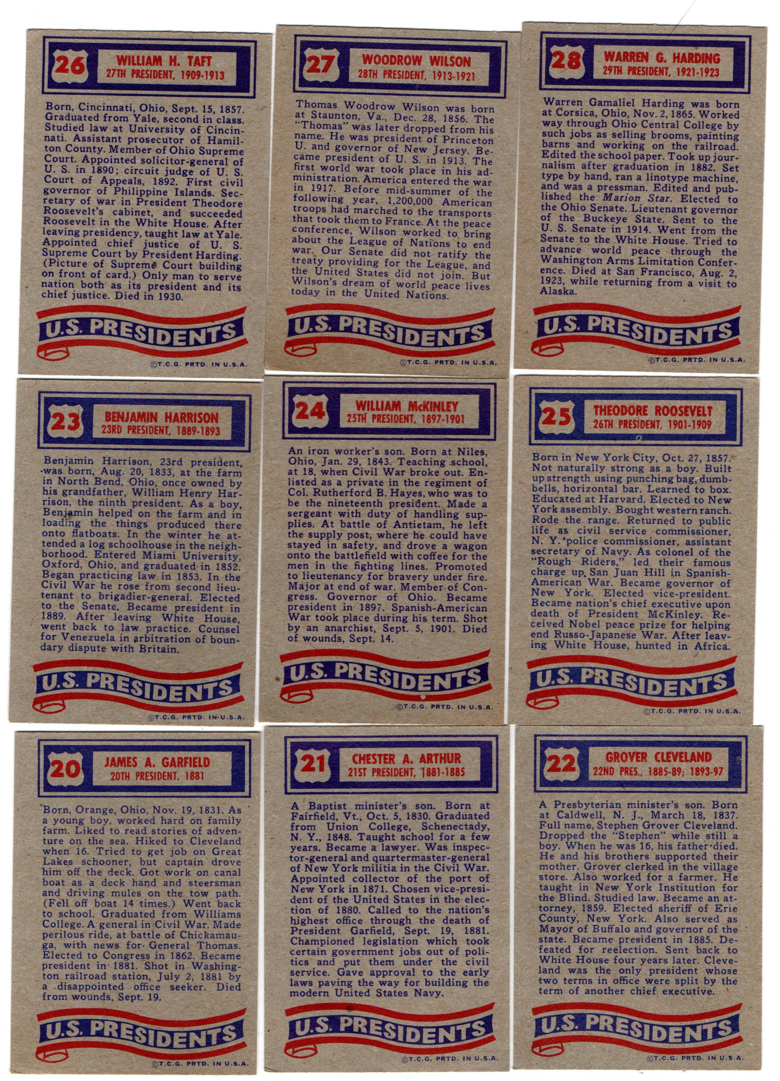 For Sale is a 1972 Topps U. S Presidents Non Sport Cards Lot of 27 Each Mid Grade. No Creases, bends, folds or Damage, All Different Numbers but Thank God no #45 or #47 Combined Shipping will be as follows: 1-4 Raw Comic Books $6 4-8 Raw Comic Books $9 9-30 Raw Comic Books Medium Flat Rate Box $16 1 Each Slabbed Comic Book $16 2 Each Slabbed Comic Books $25 3 Three or more is by Arrangement with Seller All other items for Sale shipping is in the Listings