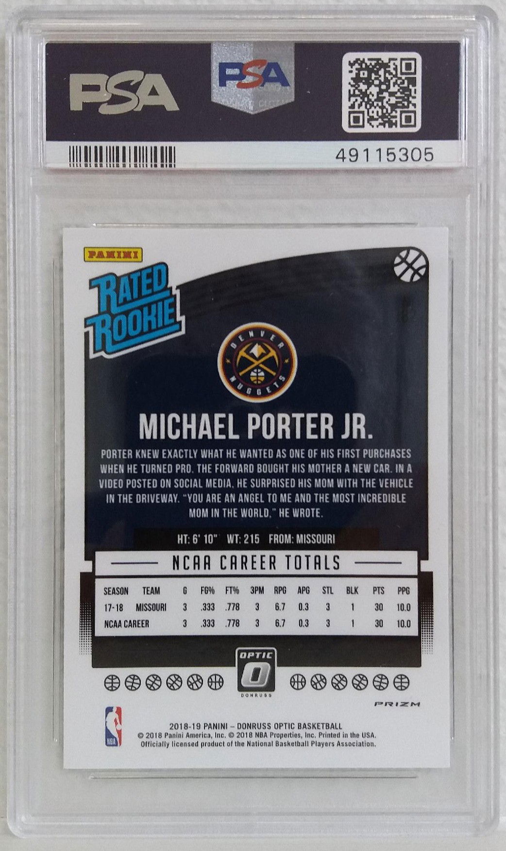 2018 Donruss Optic Shock Michael Porter Jr #182 PSA 9