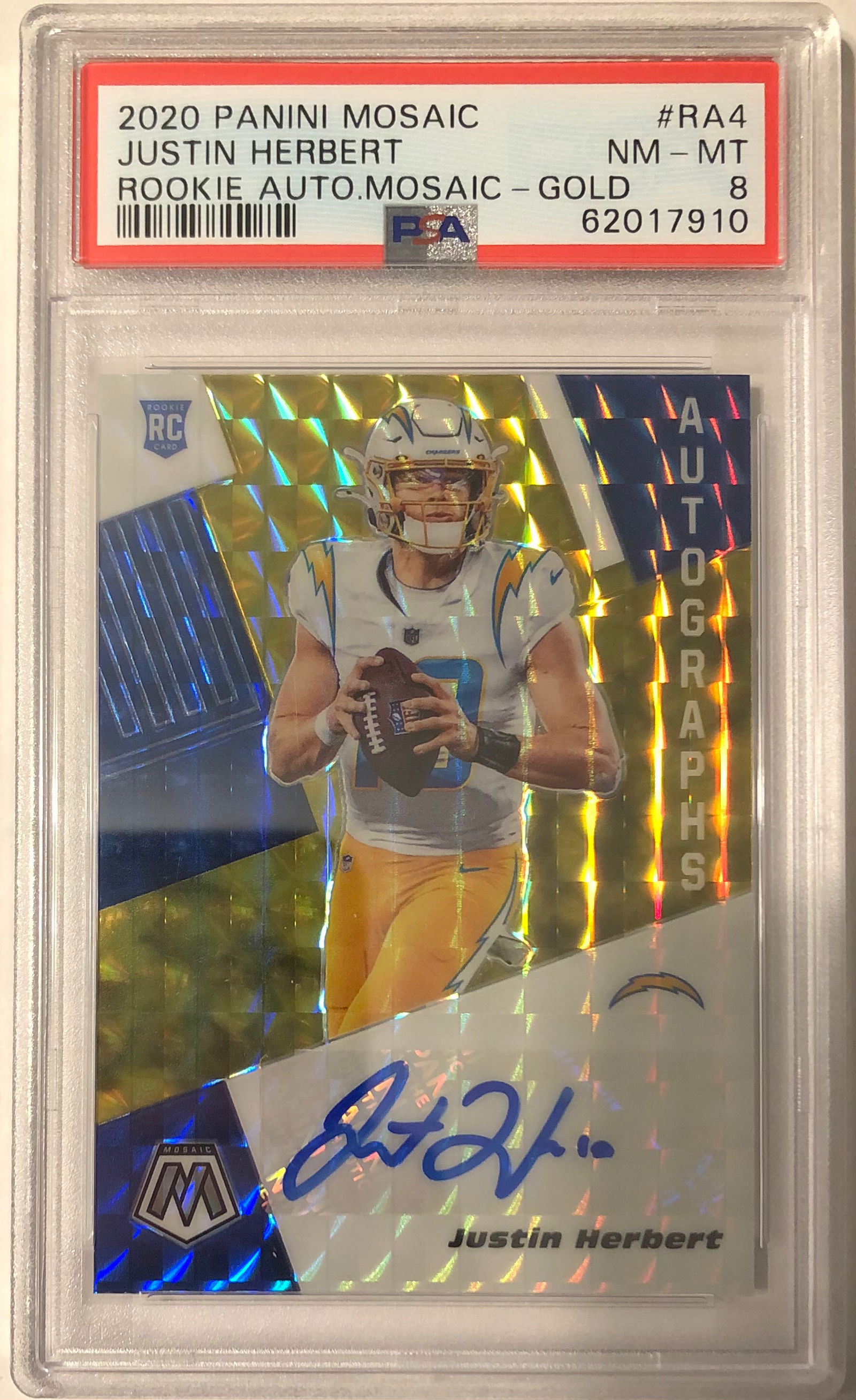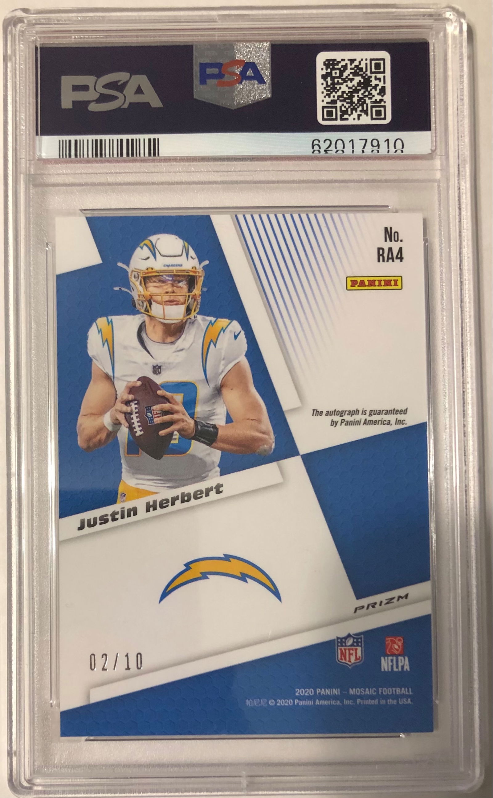 2020 Panini Mosaic Justin Herbert RC Gold Prizm Auto #RA4 2/10 PSA 8