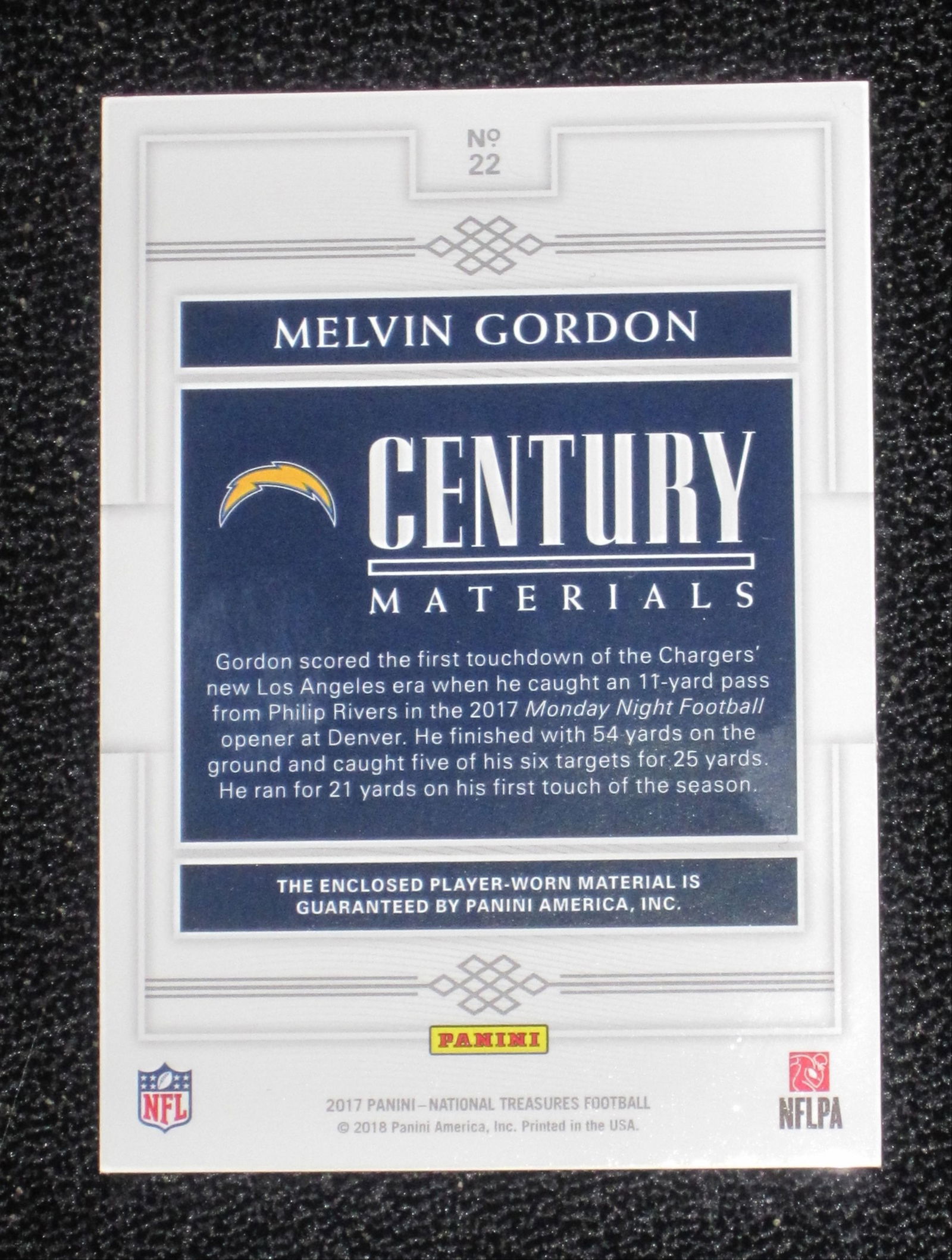 2017 NATIONAL TREASURES 3 DIFFERENT COLOR TRI- SWATCH CARD OF MELVIN GORDON OF THE SAN DIEGO CHARGERS NUMBERED 25/25 PACK FRESH!!!! [ALL SALES ARE FINAL]